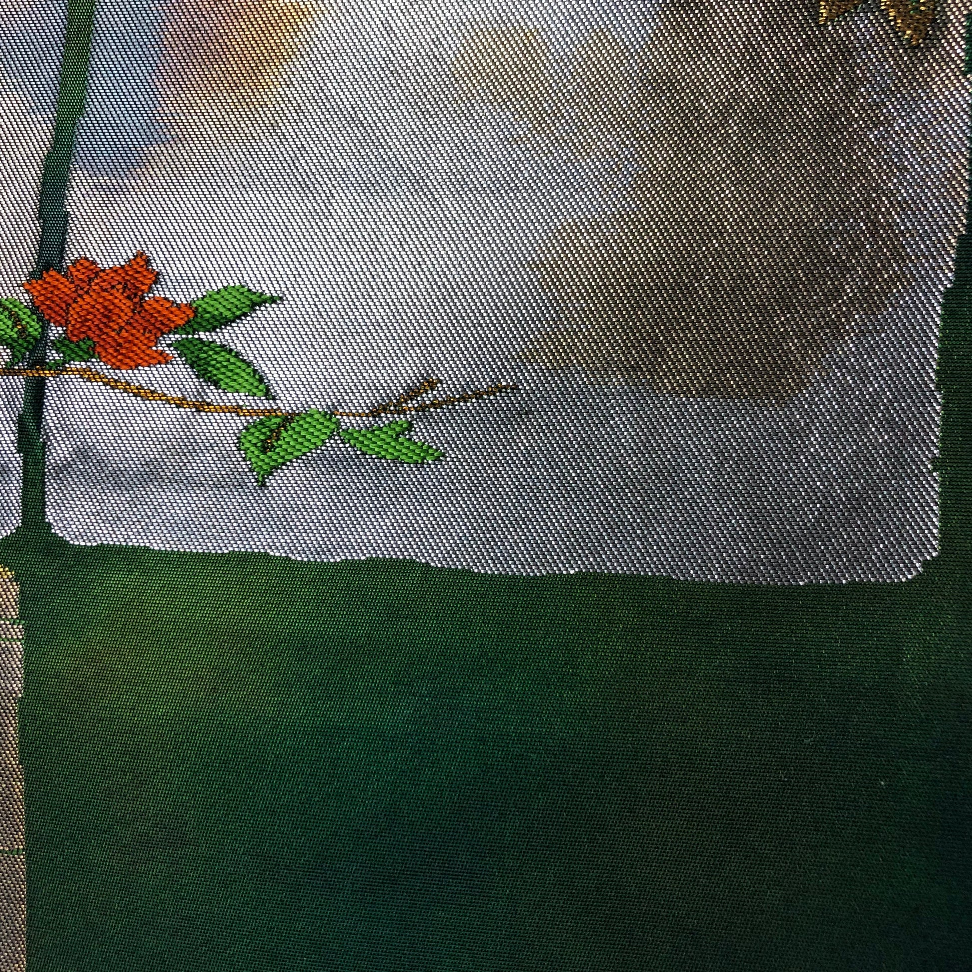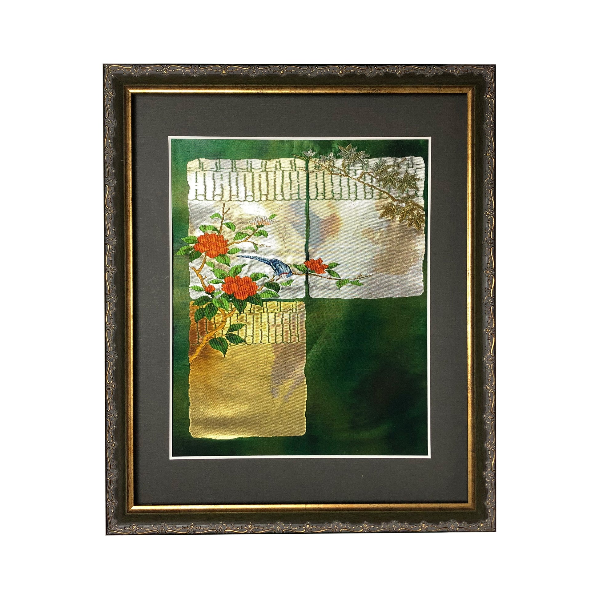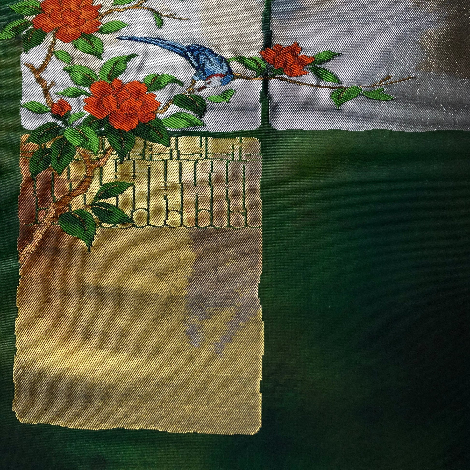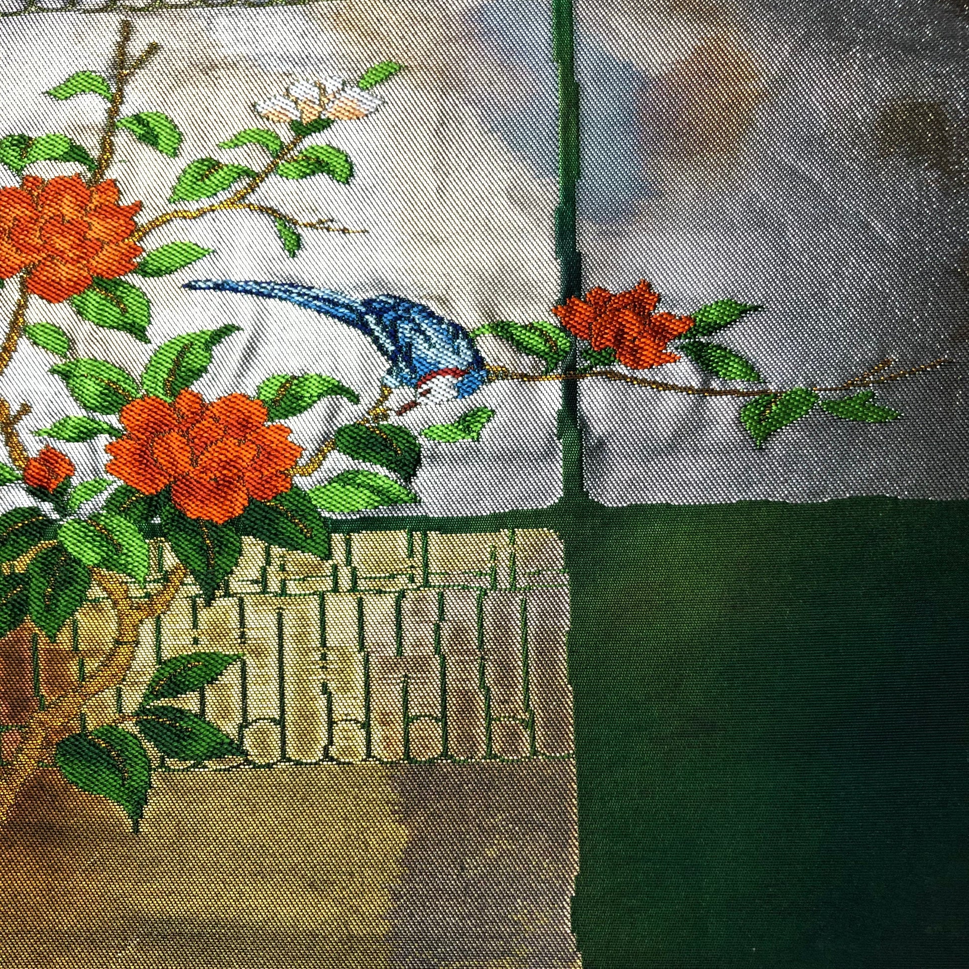 Kimono-Couture have named this splendid Japanese Kimono Art "Bird Melody." Its most captivating feature is the profound green universe it portrays. Against a deep green background, a luminous sky adorned with gold and silver foil unfolds, and songbirds perched on camellia branches create a breathtaking Kimono Art that resembles a mesmerizing melody.