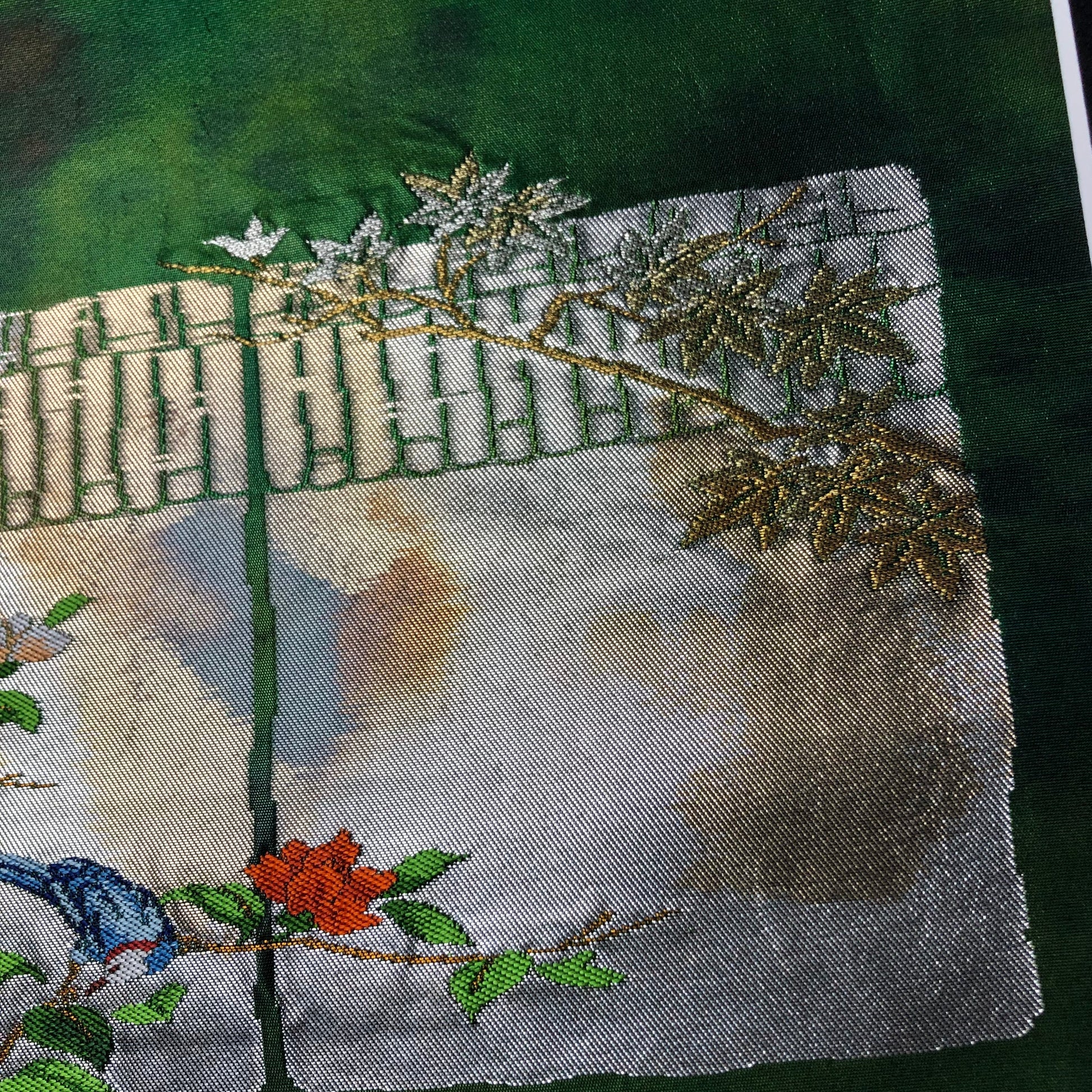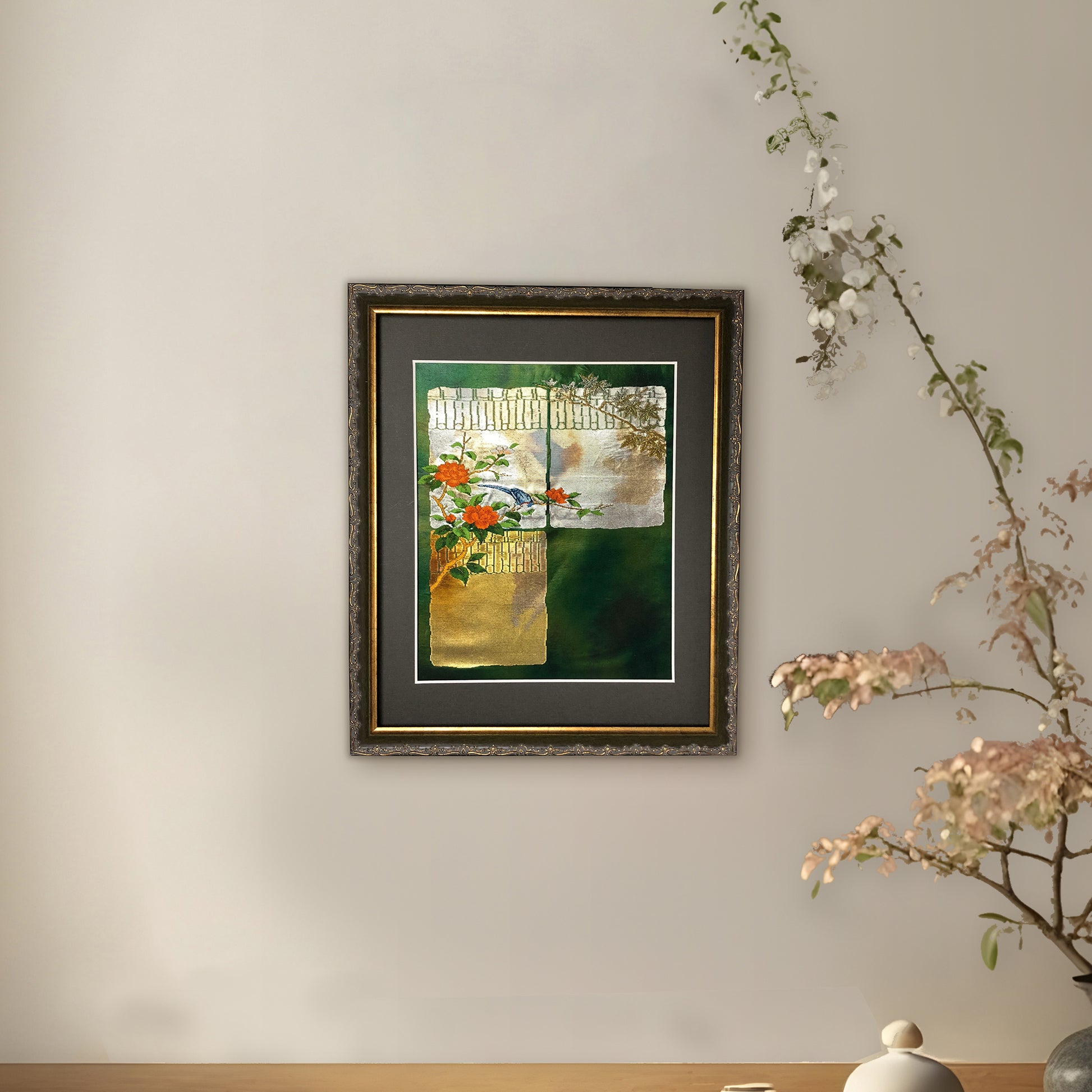 The most striking aspect of "Bird Melody" is its profound green world. Against the backdrop of deep green, a shimmering sky with gold and silver foil stretches out, and the bird singing on camellia branch is depicted as if playing a beautiful melody akin to music. This Kimono Art exudes a fantastical atmosphere, as if it has emerged from the world of Studio Ghibli, captivating the heart with its beauty.