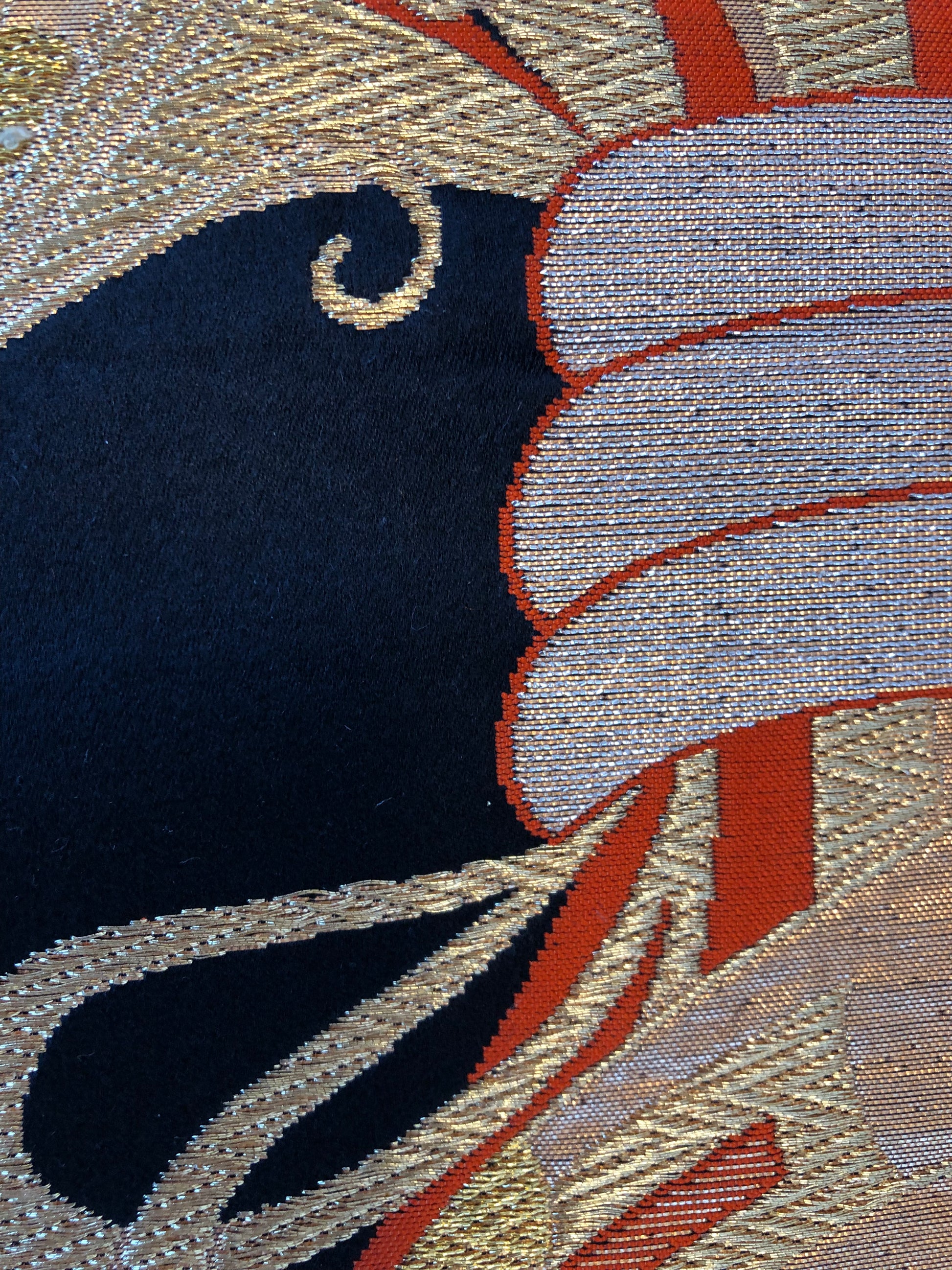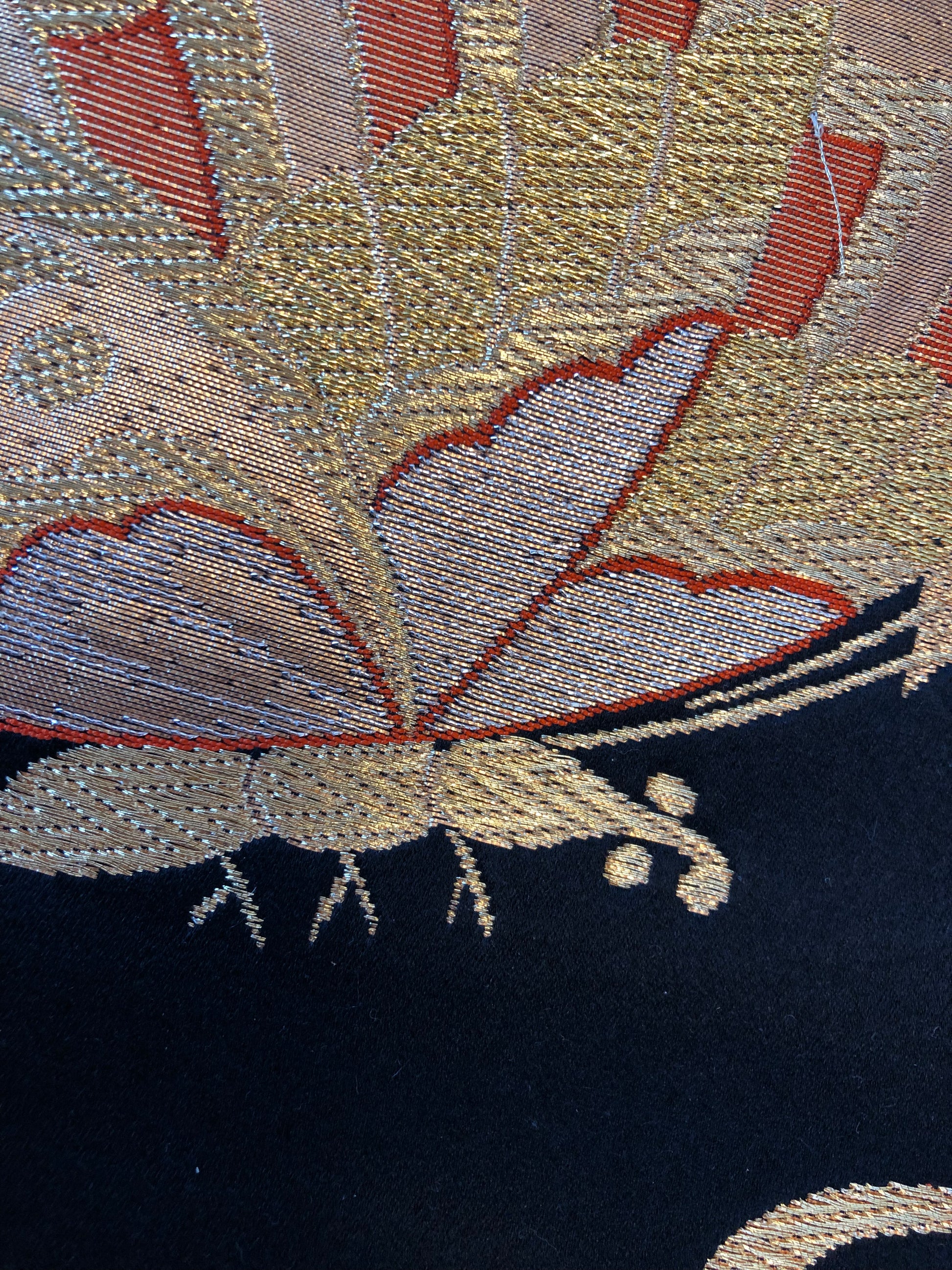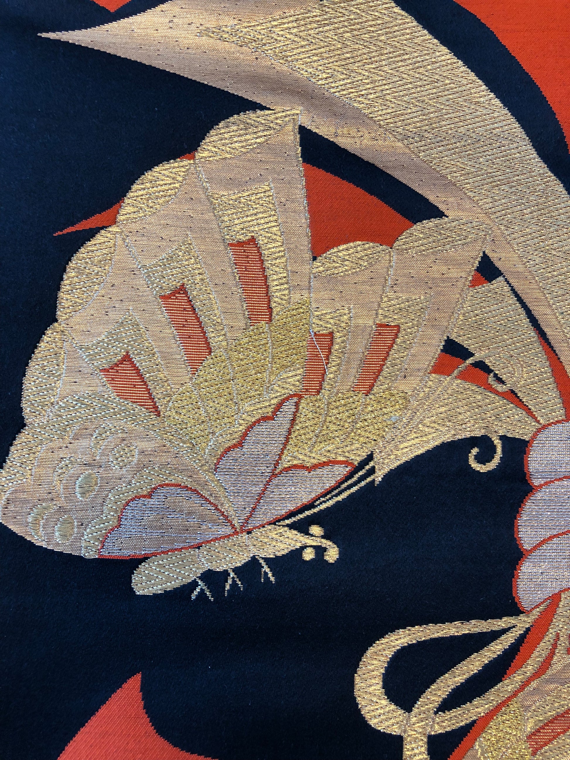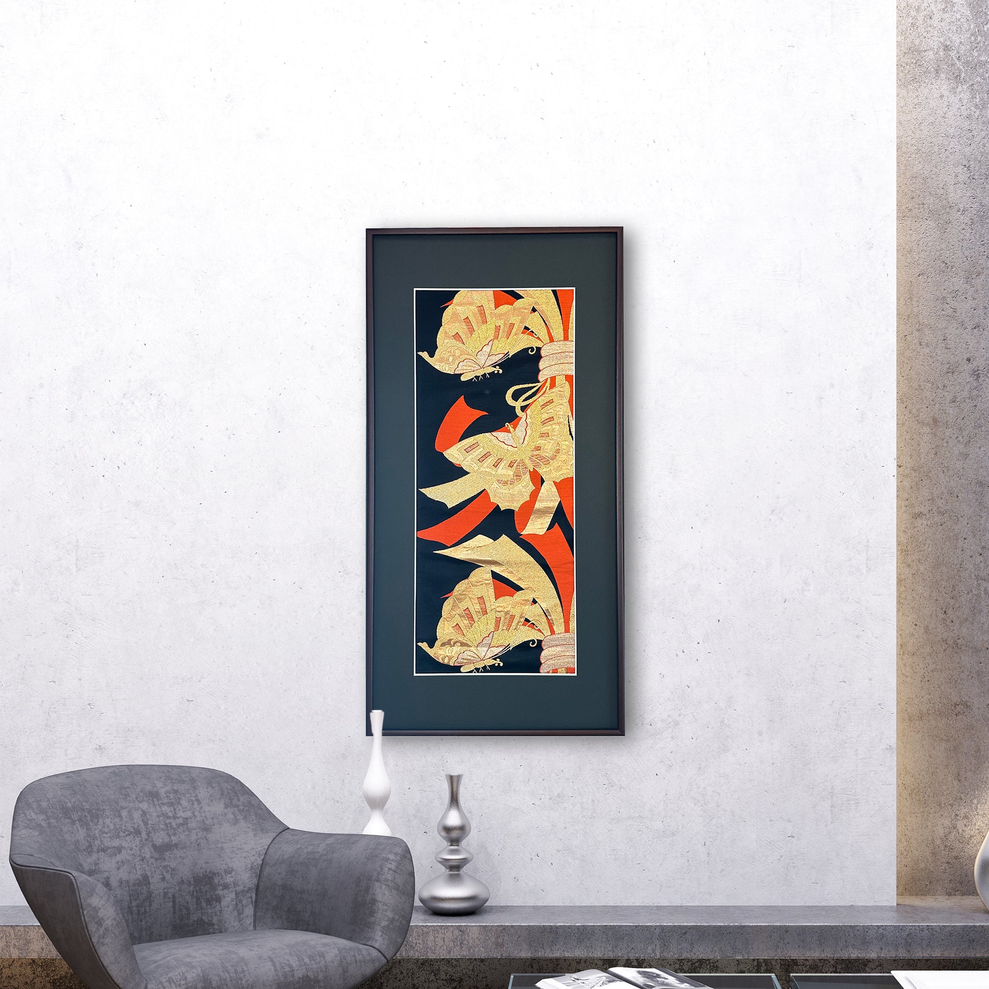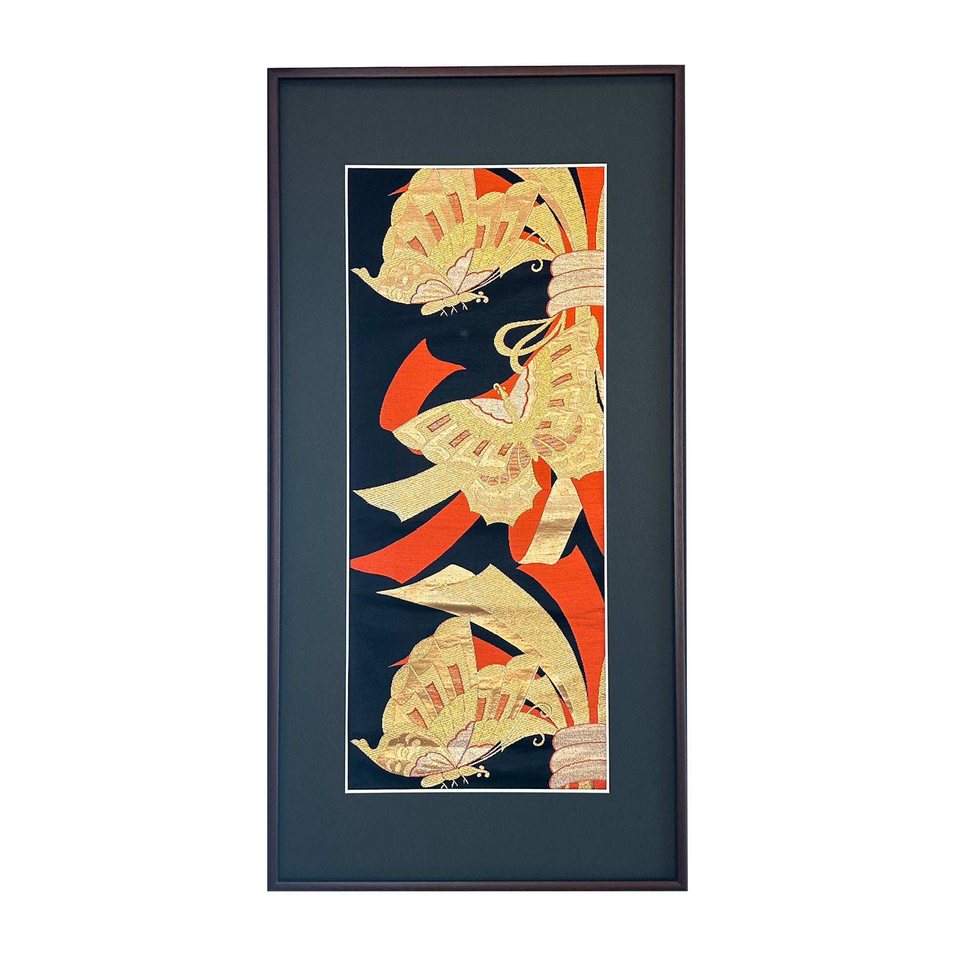 This Wall Decoration is a textile art where a kimono obi has been framed. We named this Kimono Art "Butterfly of Fortune".