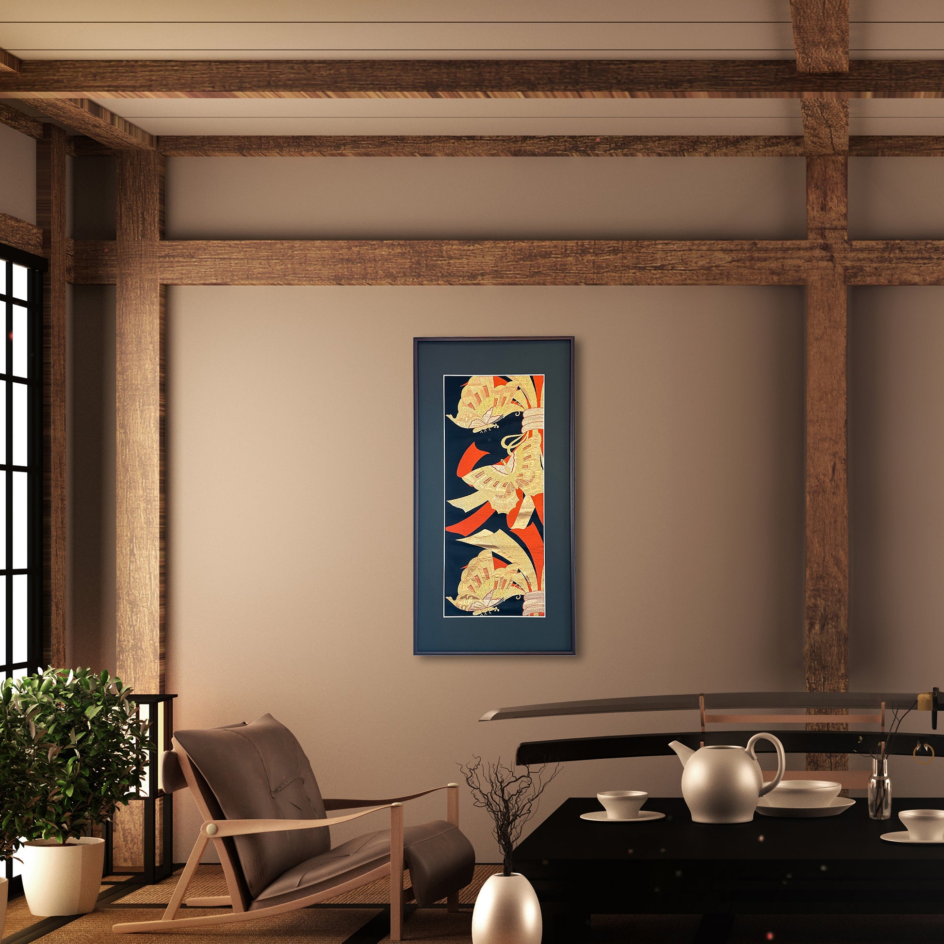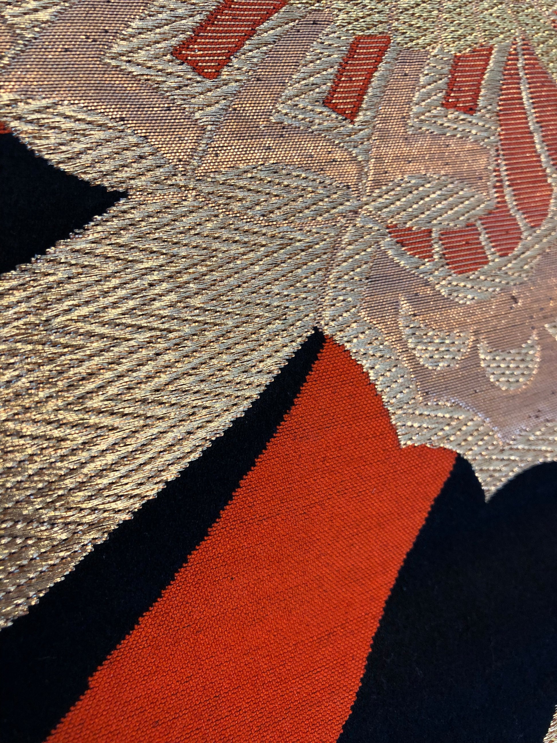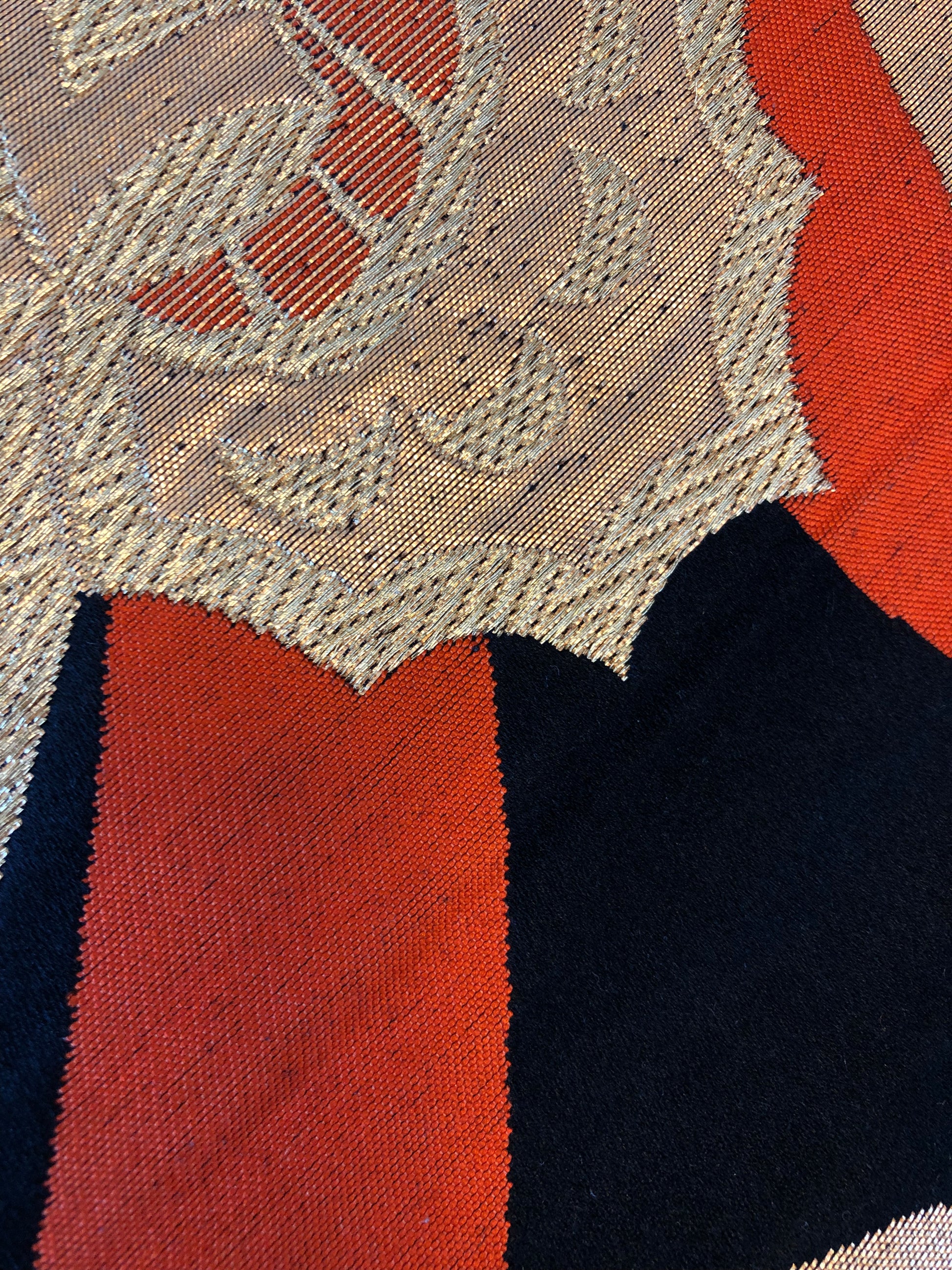 The Kimono obi framed in this Art is crafted from the finest quality silk, embellished with luxurious gold threads, gold leaf, and silver leaf. The result is a magnificent and opulent piece. By framing the Kimono in this way, we have transformed it into a striking and impressive Wall Art.