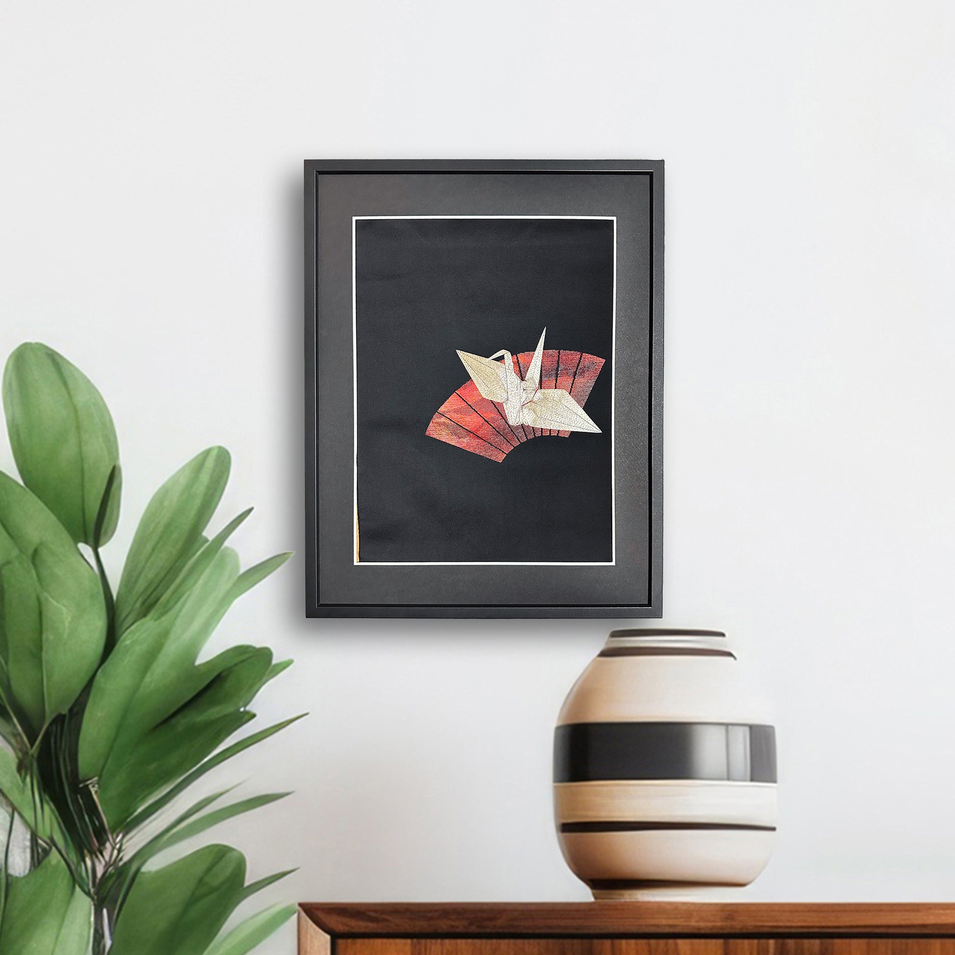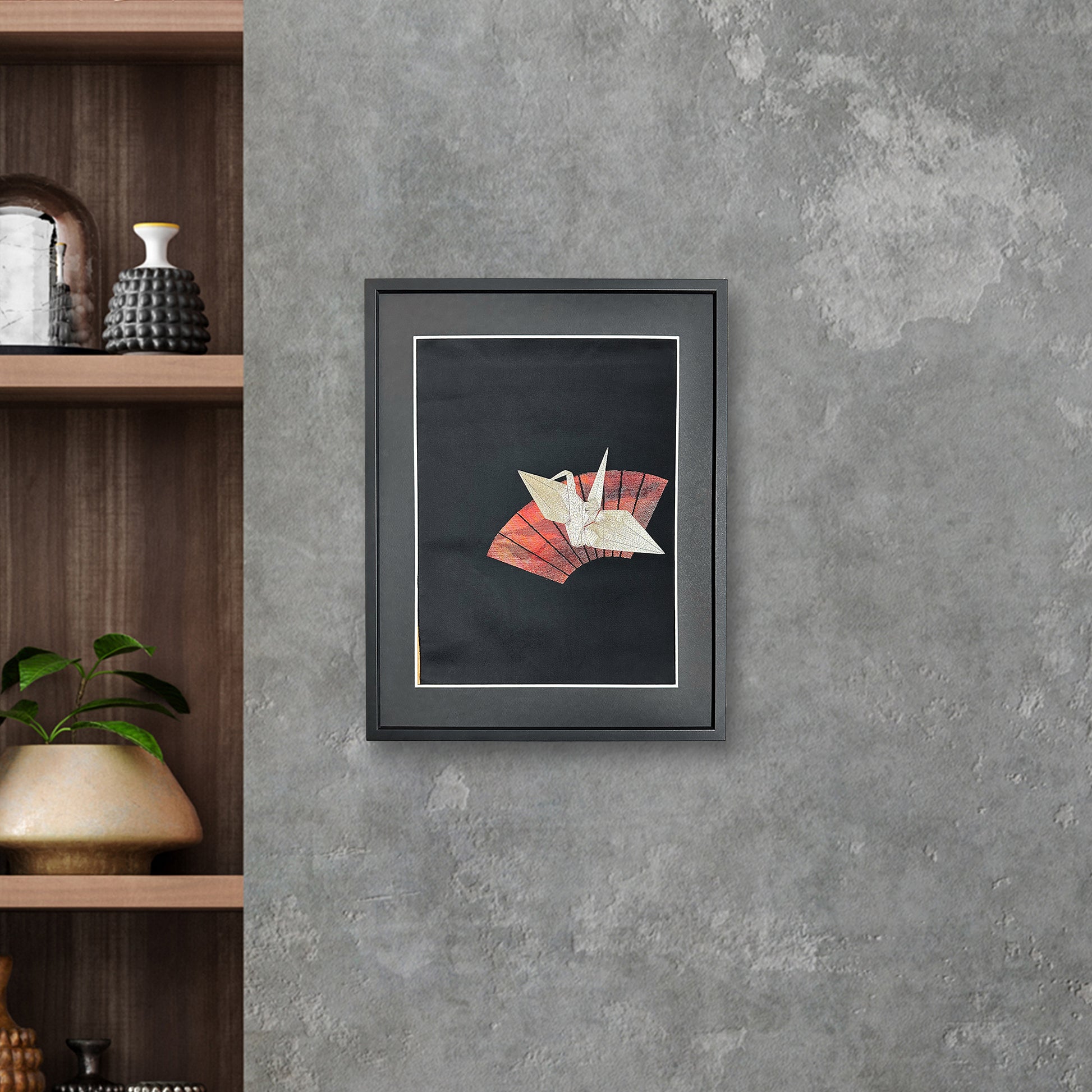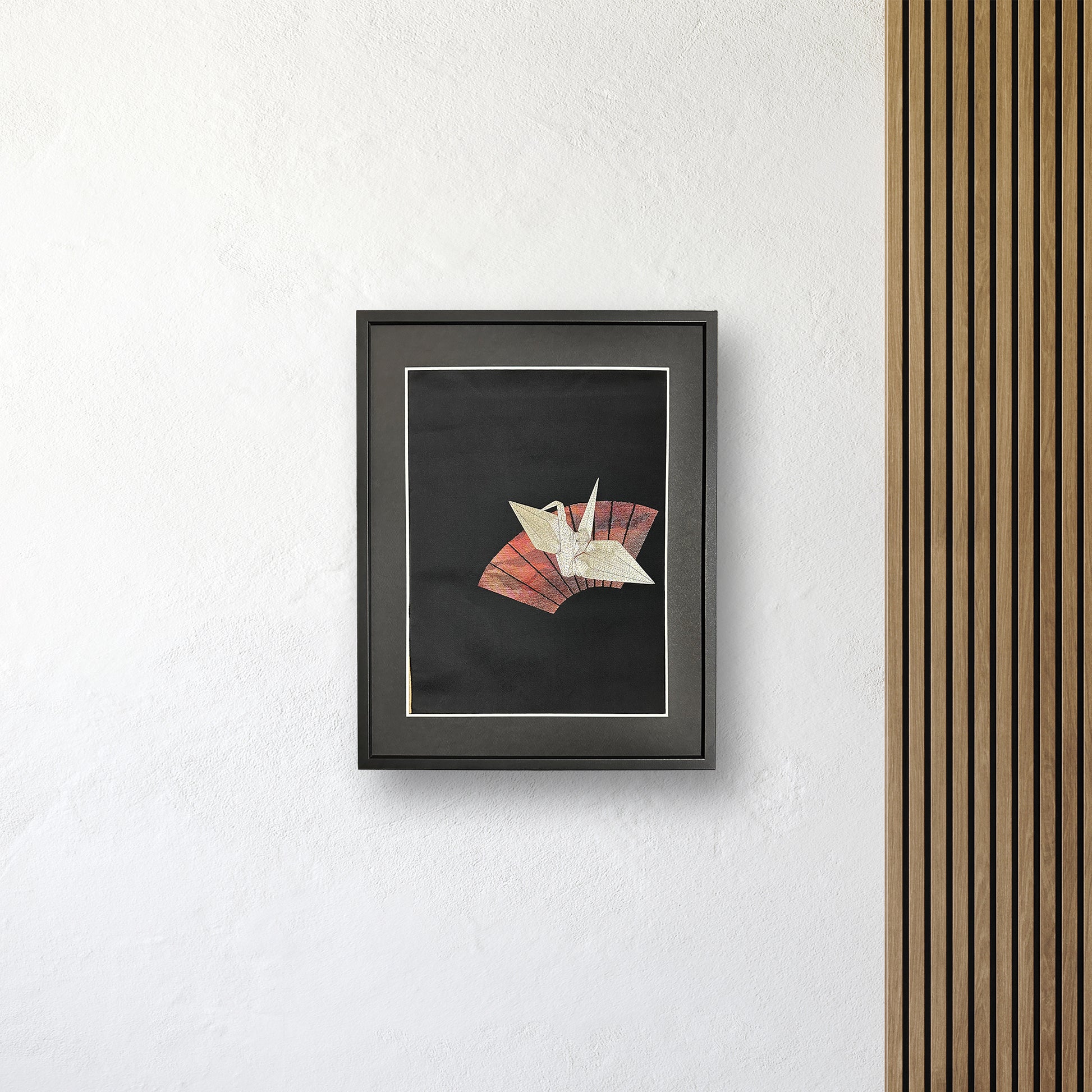 The kimono obi framed in this Japanese art is decorated with a very auspicious fan and crane pattern. As the expression "spreading out like an open fan" suggests, a fan has the meaning of "prosperity" and "good luck". For this reason, the fan pattern on kimono has been a symbol of happiness in Japan since ancient times. Since Cranes are believed to live for 1,000 years, it symbolizes "vitality" and "longevity". Also, cranes are believed to bring "marital bliss" because they stay with the same partner for the rest of their lives.