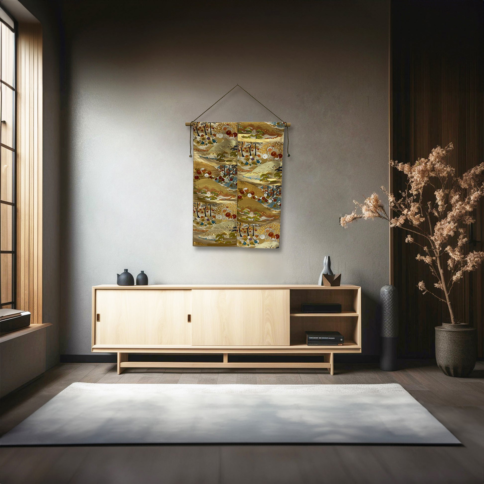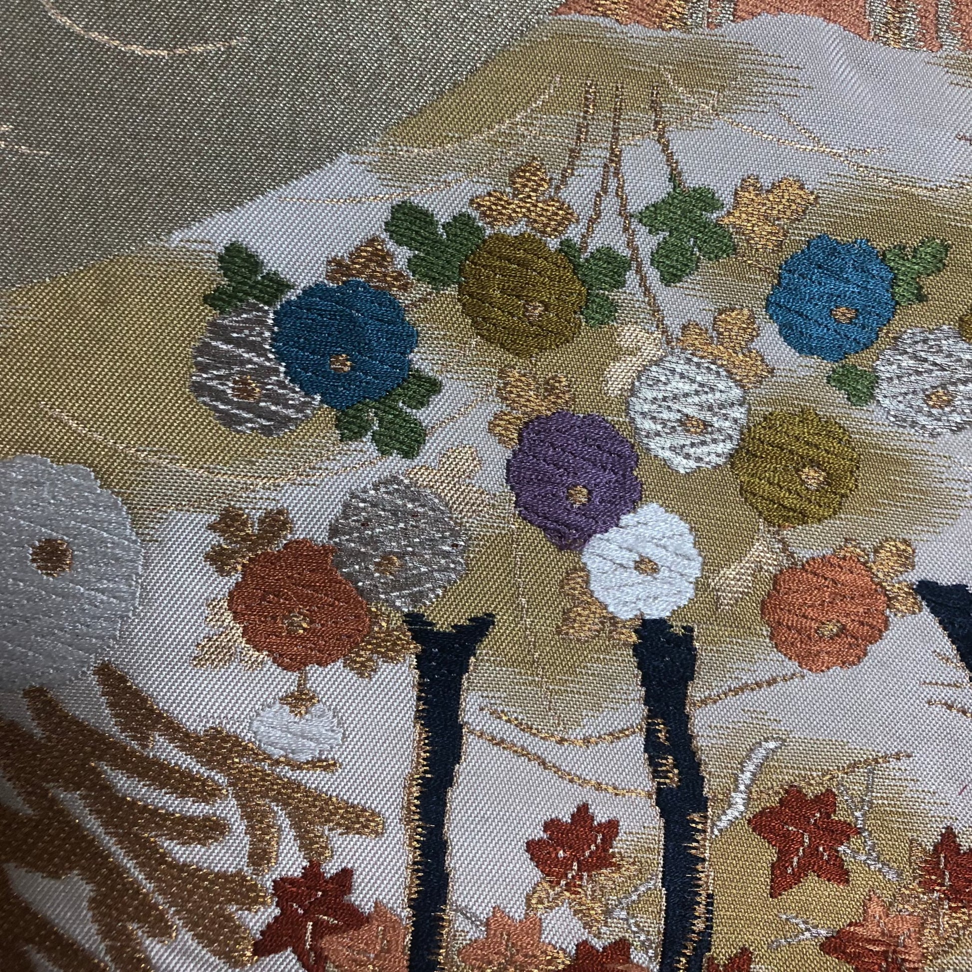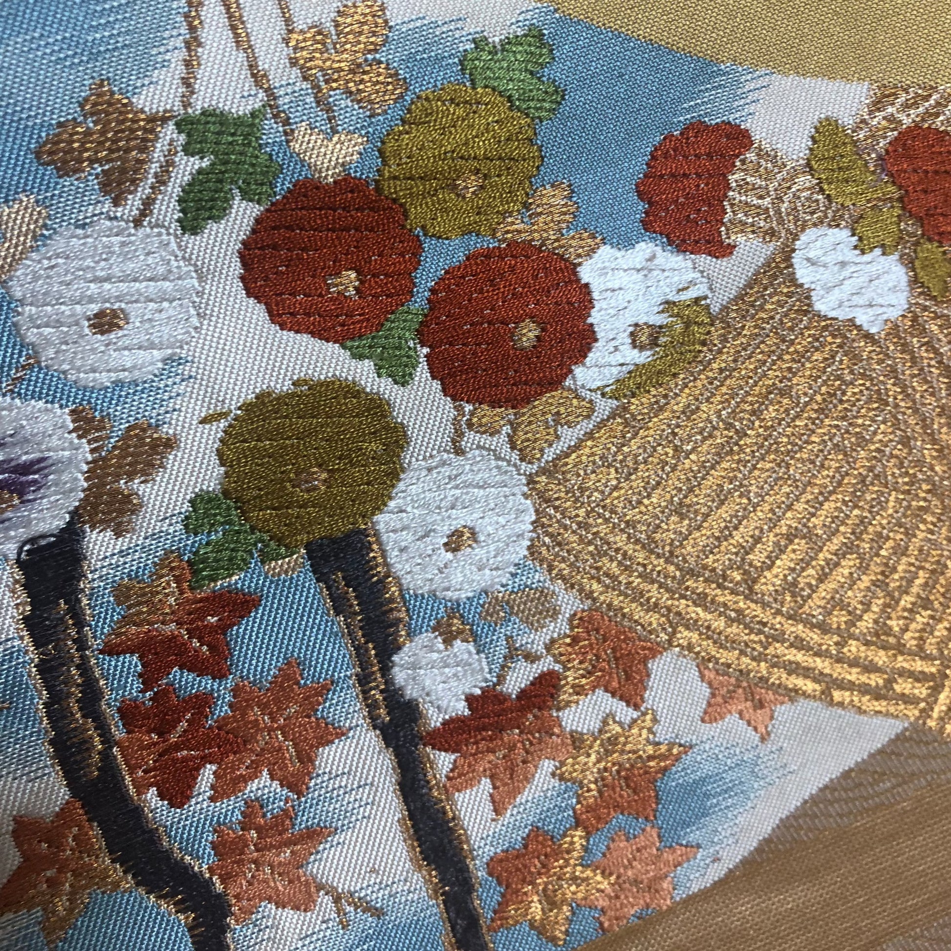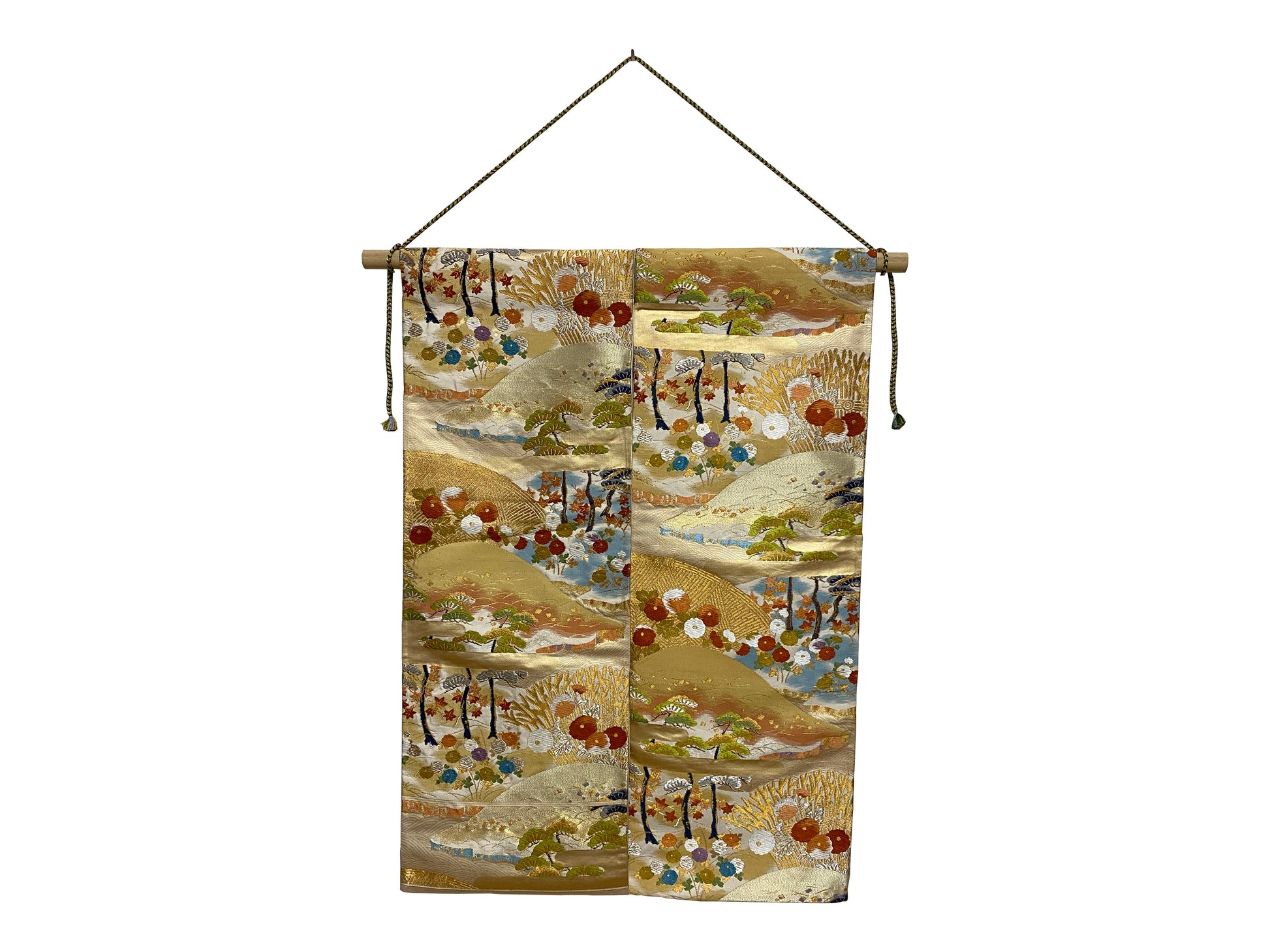This work is a tapestry of high quality kimono obi made by skilled Japanese craftsmen and repurposed as Art without compromising its beauty. Magnificent nature such as oceans, mountains, and clouds are carefully embroidered with gold thread, gold leaf, and fine silk. This gorgeous obi, with its vivid colors, is also decorated with chrysanthemums, pine trees, autumn leaves, and other patterns that remind us of the four seasons in Japan. The chrysanthemums embroidered on this obi are a wish for "good health. In addition, pine trees have been loved since ancient times as a symbol of "longevity" because they keep their beautiful deep green color even in cold winters. Above all, the distinctive pattern of this obi is the clouds embroidered with beautiful light blue silk. Clouds are said to be the abode of dragons and gods, and are believed to be omens (auspicious omens) of good things to come. This is why cloud patterns have been used as a pattern for kimonos for congratulatory purposes. Please enjoy the tapestry, which is filled with wishes for "good health" and "long life" and also has the meaning of "good omen".