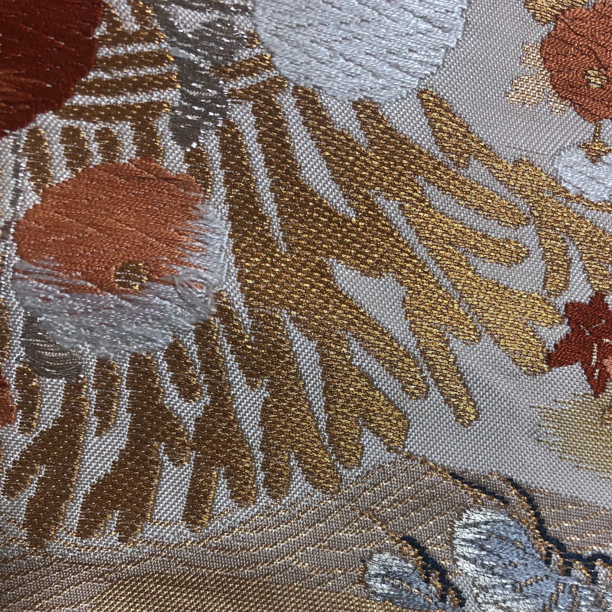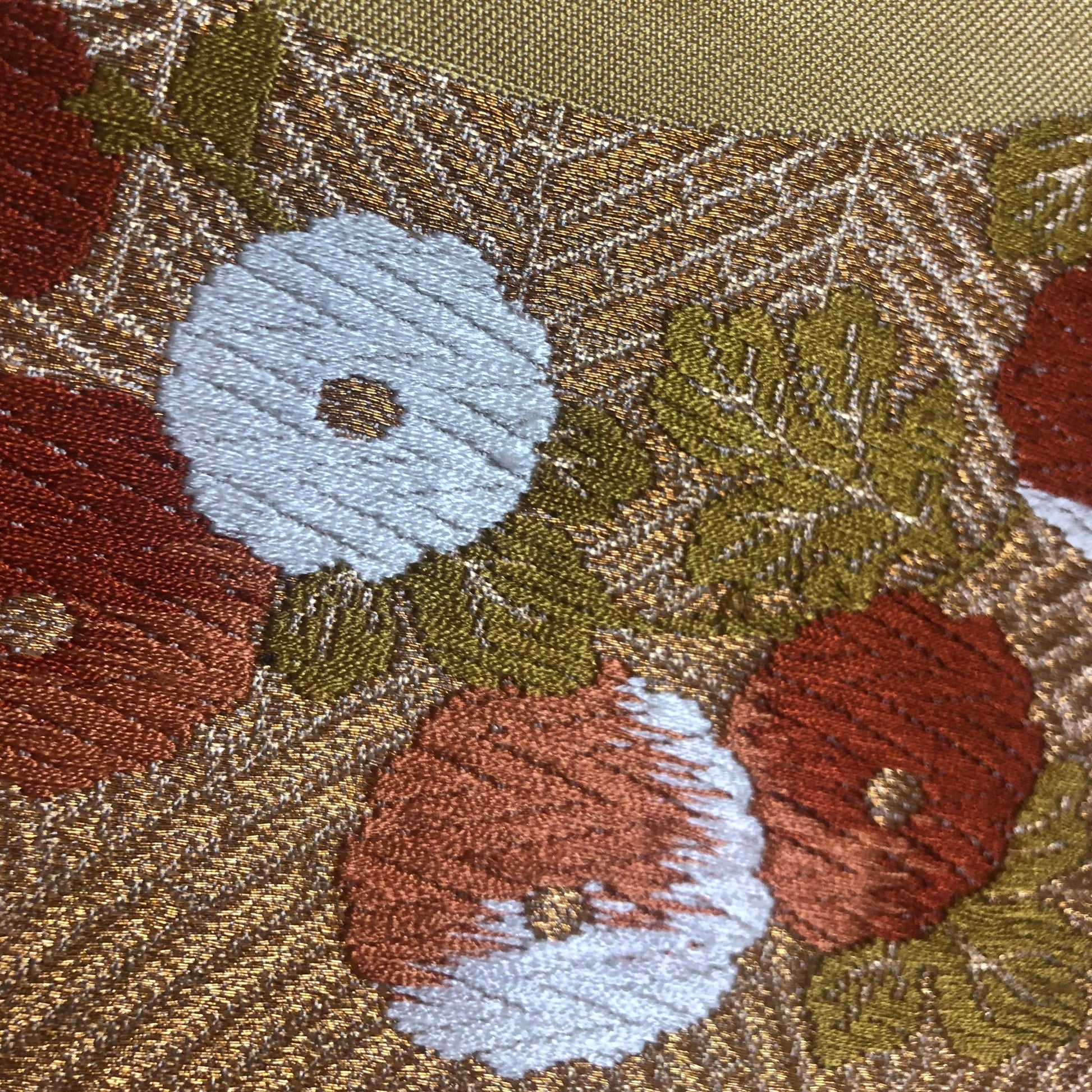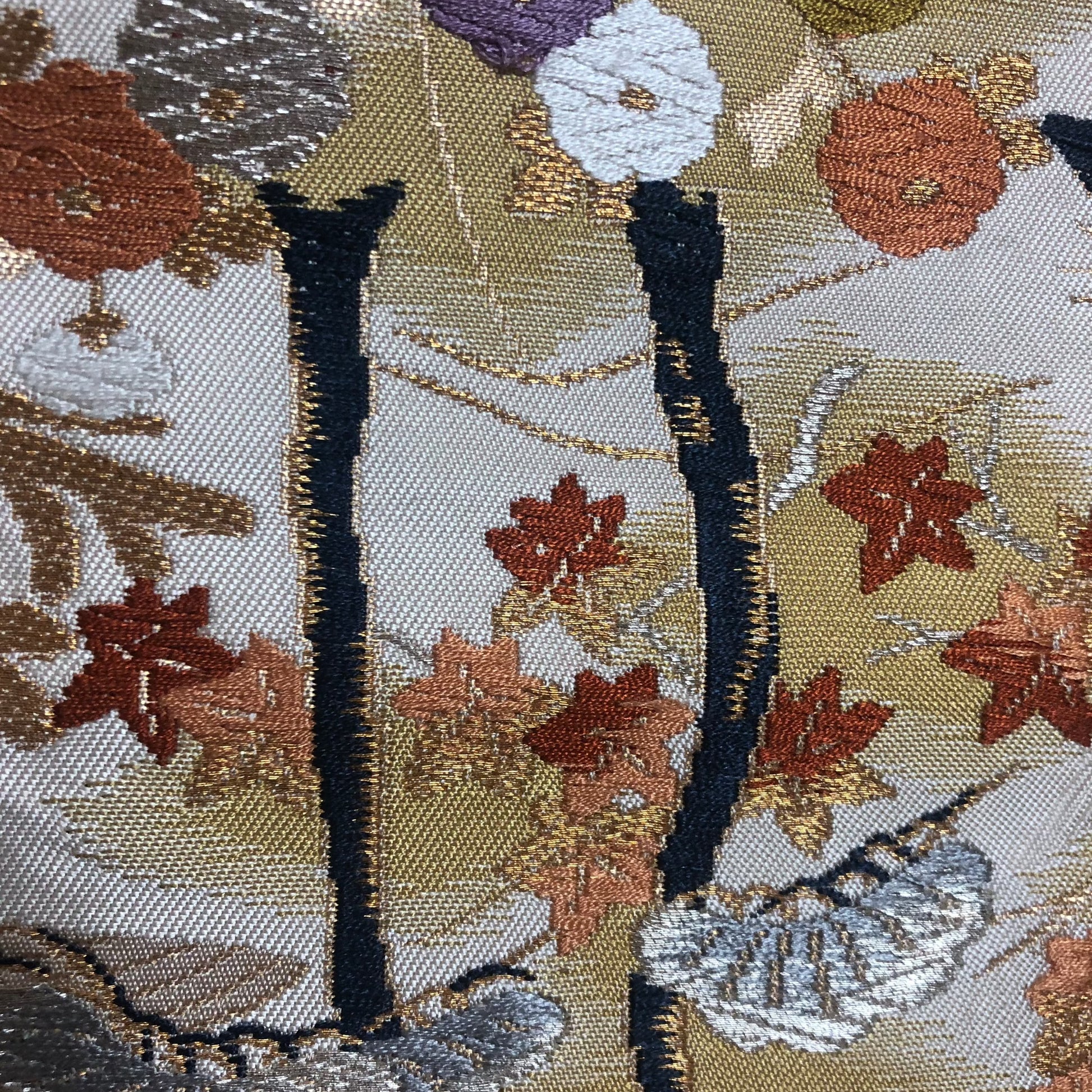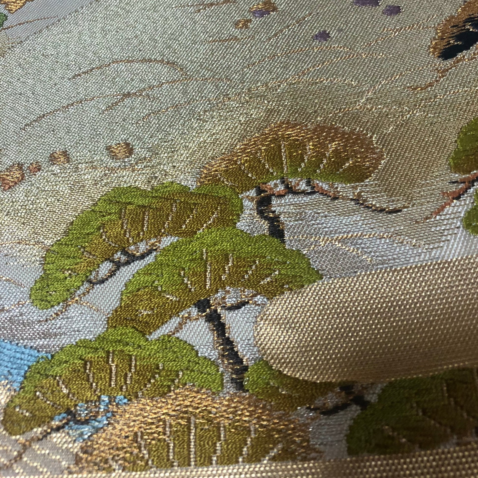 This work is a tapestry of high quality kimono obi made by skilled Japanese craftsmen and repurposed as Art without compromising its beauty. Magnificent nature such as oceans, mountains, and clouds are carefully embroidered with gold thread, gold leaf, and fine silk. This gorgeous obi, with its vivid colors, is also decorated with chrysanthemums, pine trees, autumn leaves, and other patterns that remind us of the four seasons in Japan. The chrysanthemums embroidered on this obi are a wish for "good health. In addition, pine trees have been loved since ancient times as a symbol of "longevity" because they keep their beautiful deep green color even in cold winters. Above all, the distinctive pattern of this obi is the clouds embroidered with beautiful light blue silk. Clouds are said to be the abode of dragons and gods, and are believed to be omens (auspicious omens) of good things to come. This is why cloud patterns have been used as a pattern for kimonos for congratulatory purposes. Please enjoy the tapestry, which is filled with wishes for "good health" and "long life" and also has the meaning of "good omen".