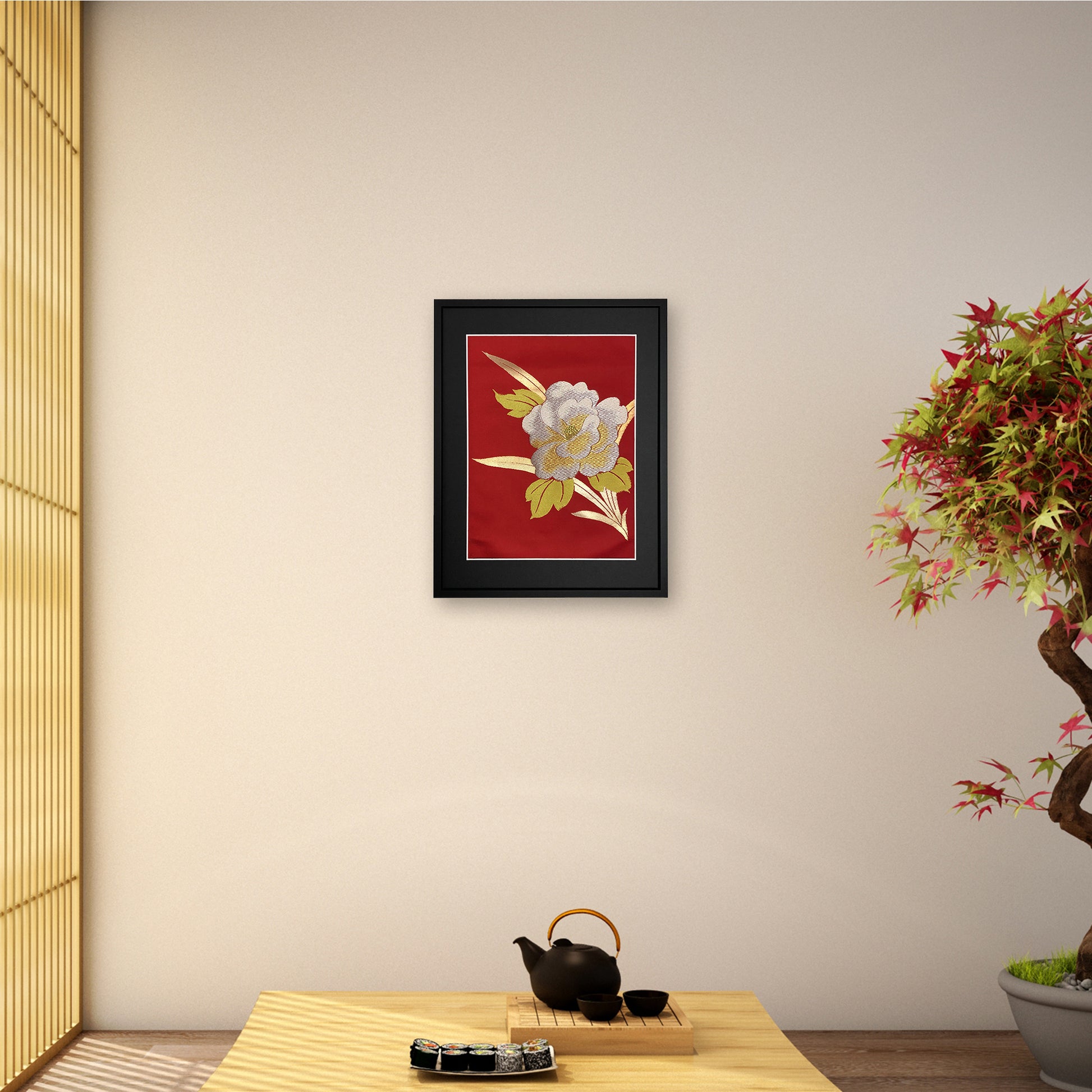 In Japan, kimonos with Peony pattern are often use for celebratory events like weddings and anniversaries. This Kimono Art makes for an ideal gift for such occasions. Consider including the peony's symbolic meanings as heartfelt wishes for the recipient's joy and prosperity.