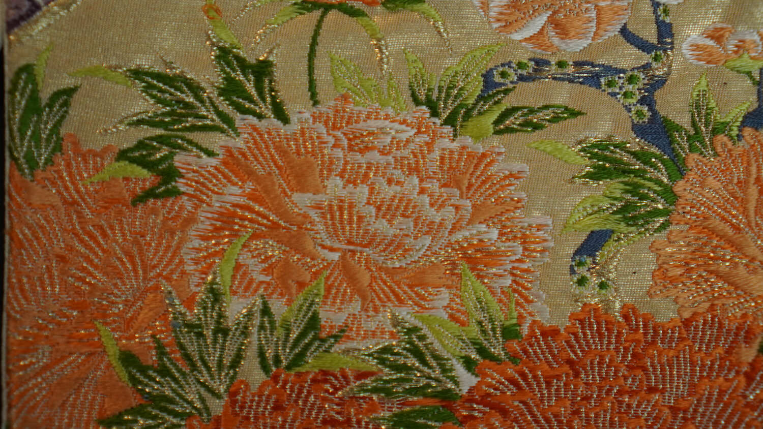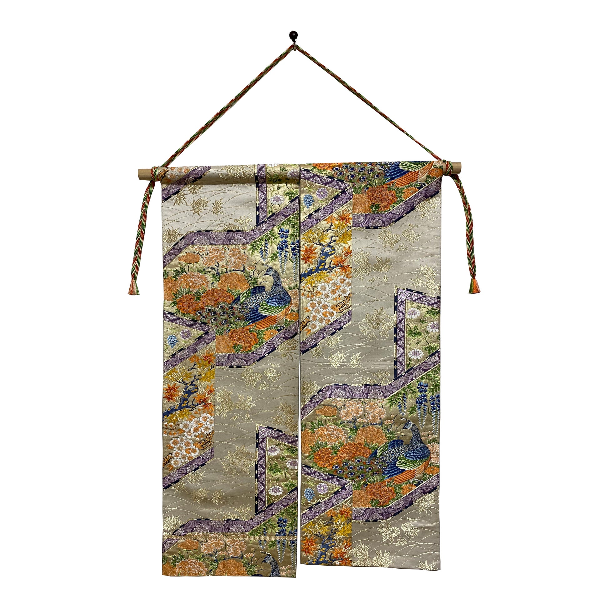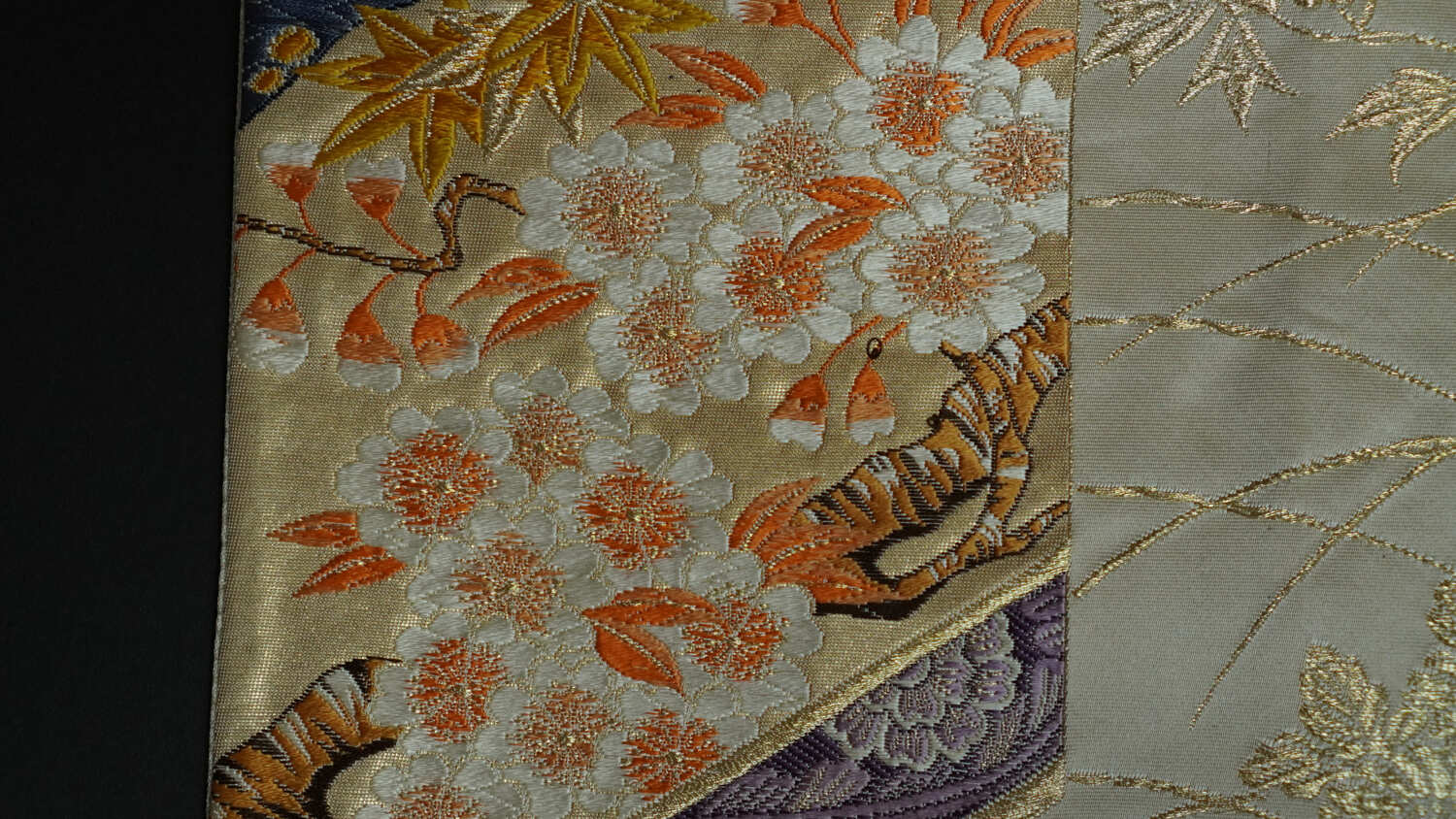 We are proud to present this piece, embroidered with peacocks and flowers of the four seasons on a silk fabric based on the traditional color called “Kinari.”