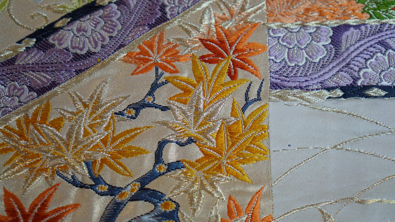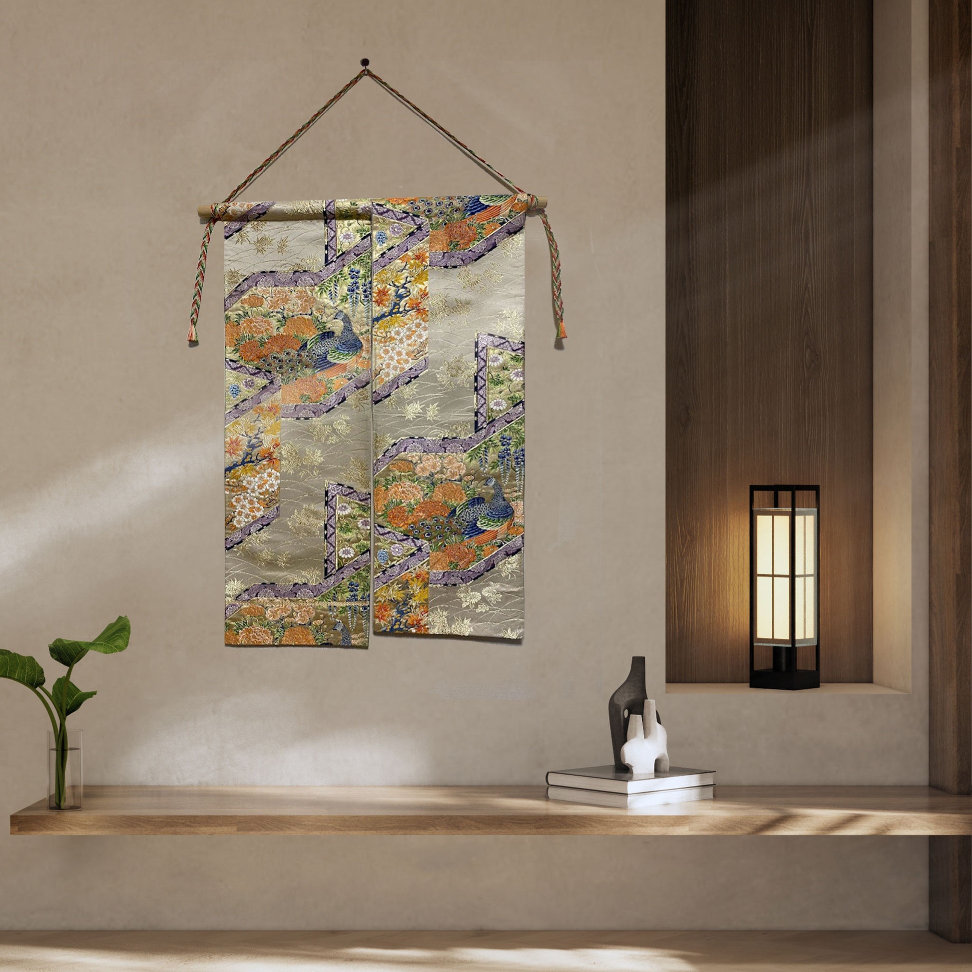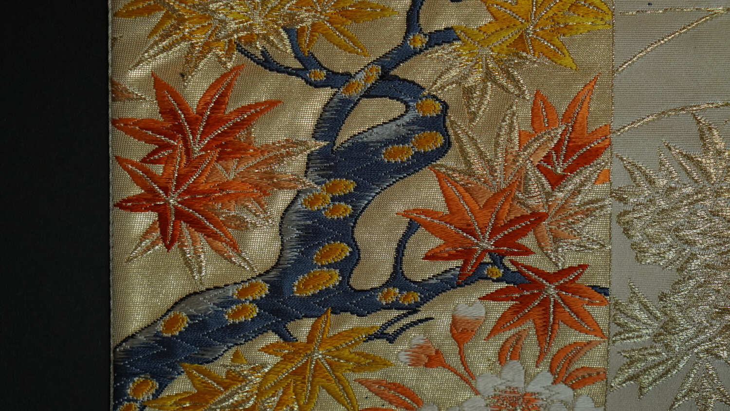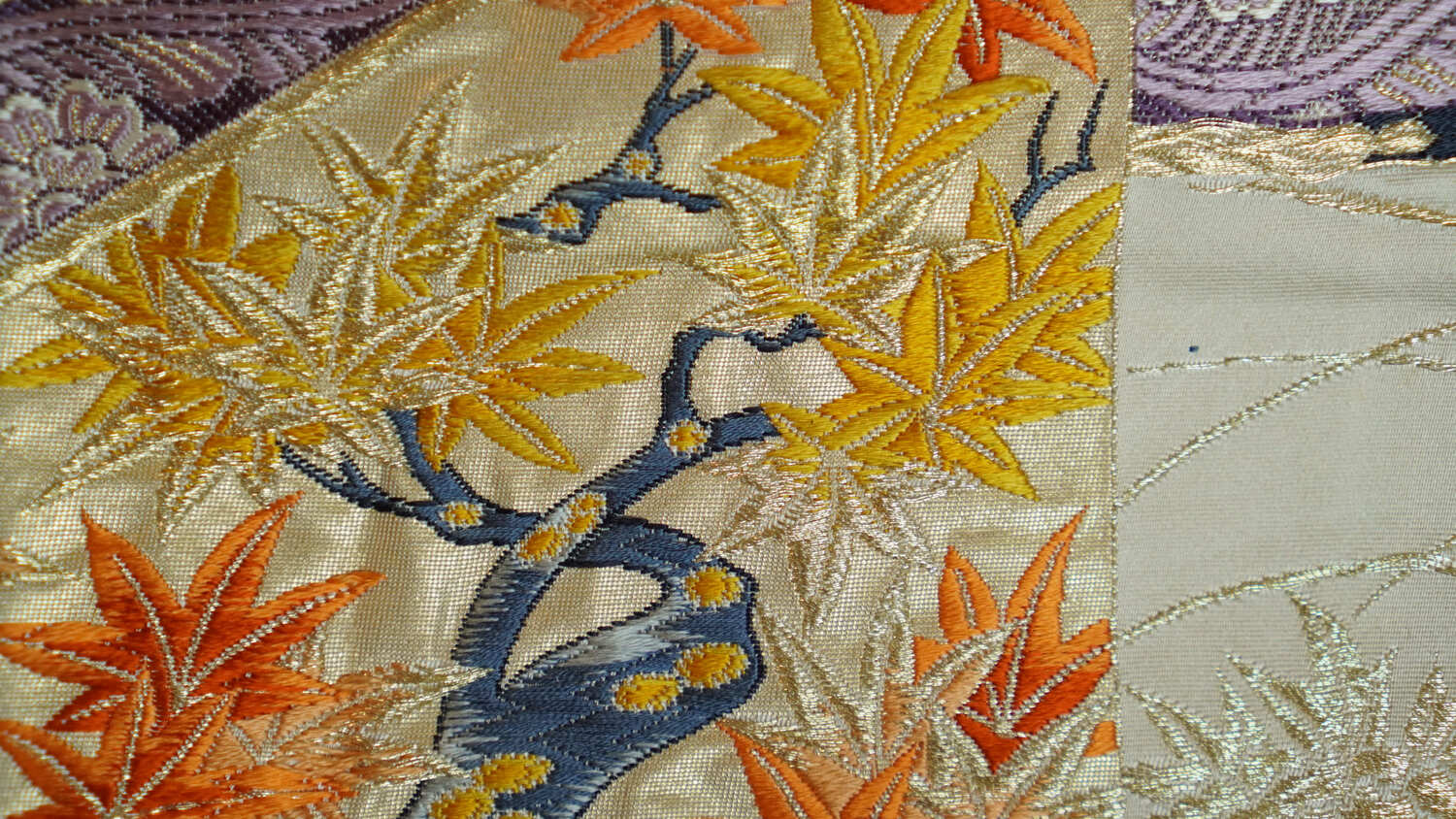 We are proud to present this piece, embroidered with peacocks and flowers of the four seasons on a silk fabric based on the traditional color called “Kinari.”