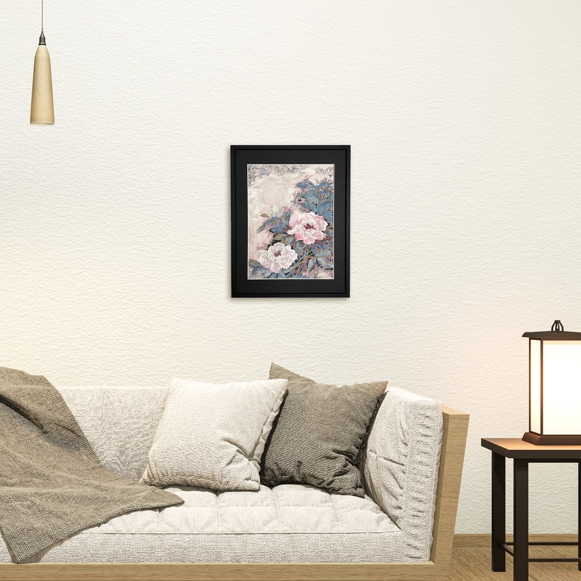 The hallmark of this Kimono Art is its three-dimensional peony motif. Peonies are revered as the "King of Flowers" due to their beauty and splendor, and their symbolism includes attributes such as "regal elegance" and "prosperity." The peonies depicted in this Kimono Art are exquisitely beautiful, resembling a painting and exuding the regal elegance that earned them their royal reputation.