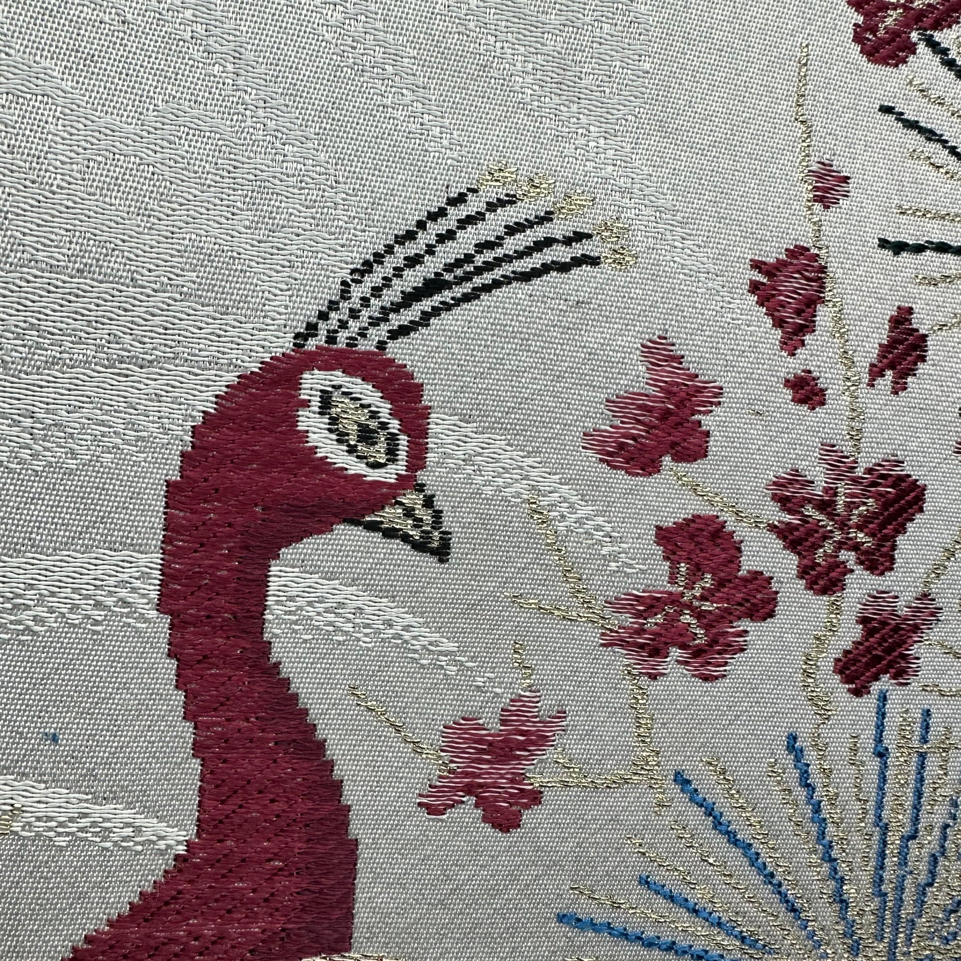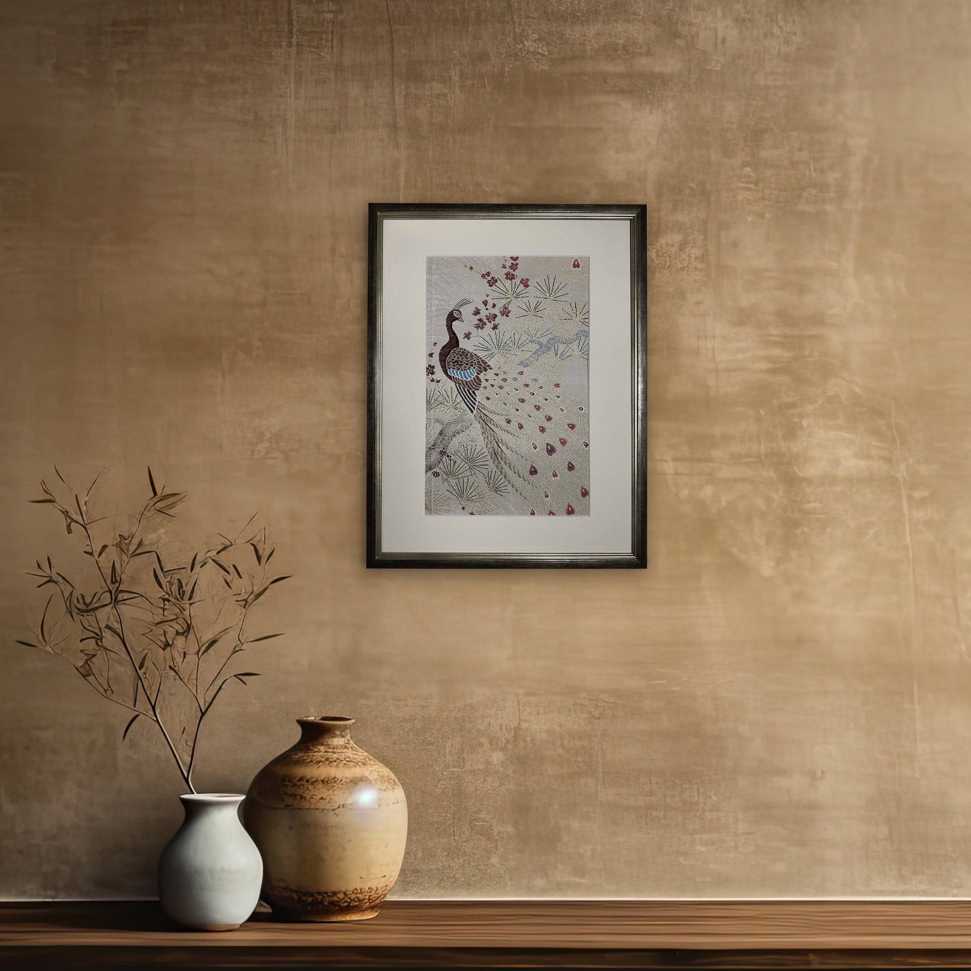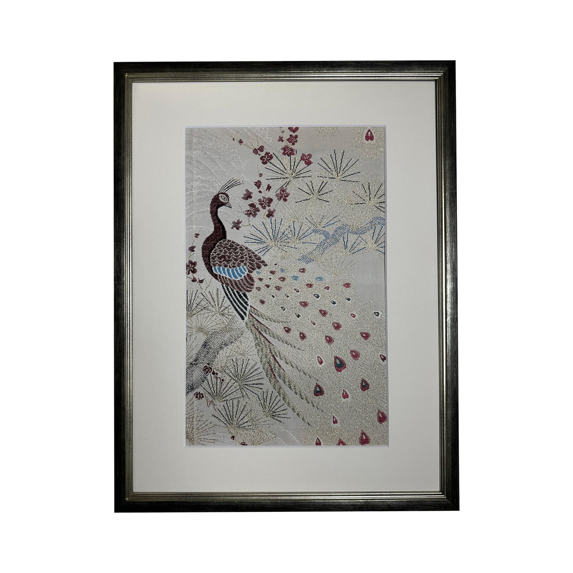 Kimono-Couture is proud to present the "Peacock Paradise" Kimono Art. This Japanese Wall Art has been carefully crafted by selecting and processing special sections of the finest Japanese obi sashes, and framing them. As the title of this Kimono Art suggests, its theme is the majestic peacock.