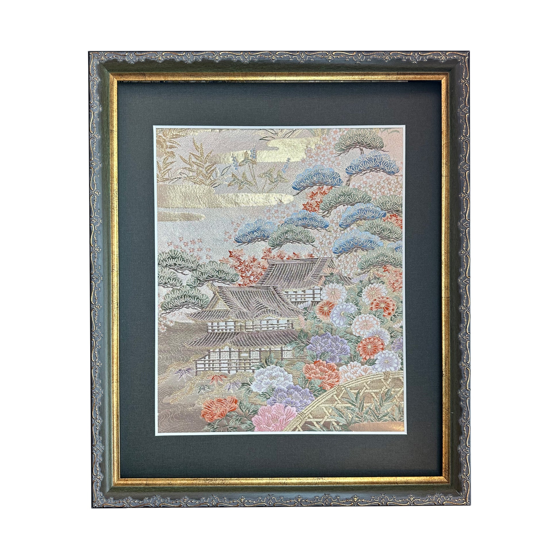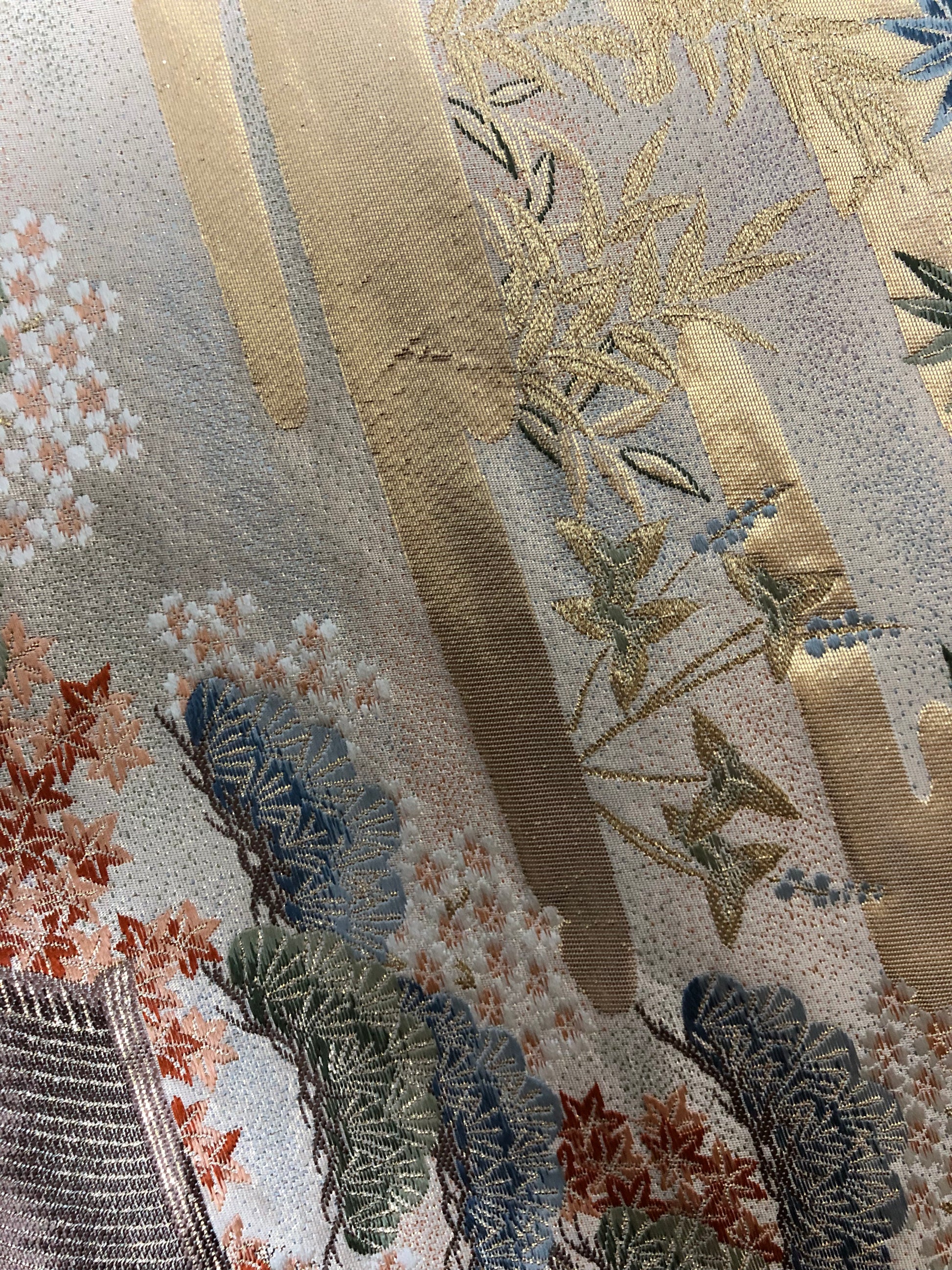 Crafted from opulent silk fabric and adorned with intricate gold leaf embroidery and a vibrant palette of twelve silk thread colors, this kimono obi embodies timeless luxury. It showcases iconic Japanese temples, serene gardens, and an exquisite array of seasonal flowers, including peonies, chrysanthemums, plums, cherry blossoms, pine trees, bamboo grass, autumn leaves, irises, and caresses.