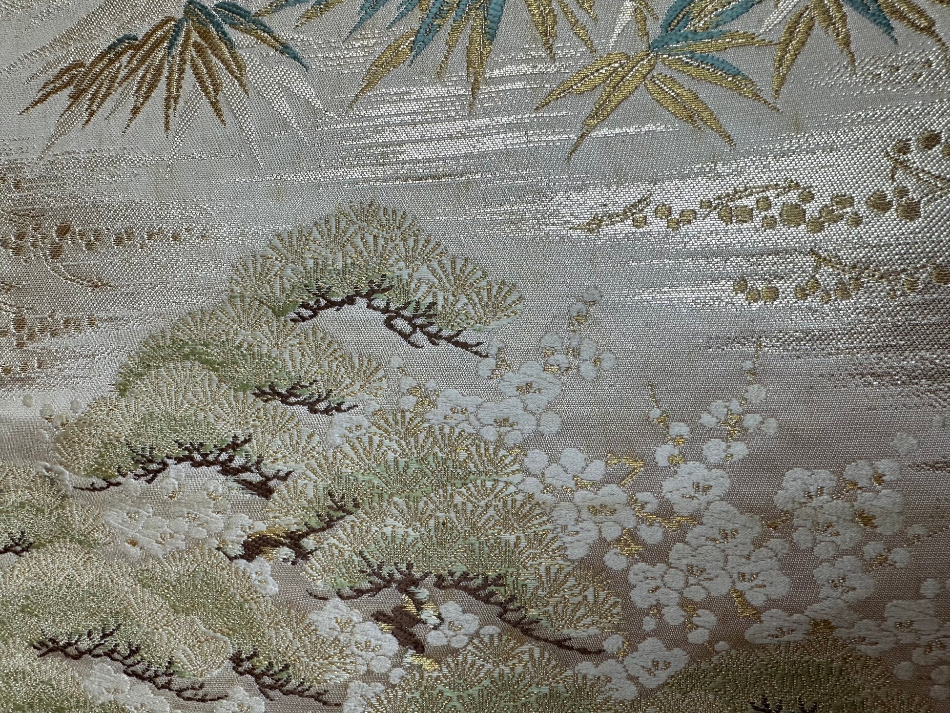 In addition to the crane, this Kimono Art features motifs of pine, bamboo, plum blossoms, and waves. In the world of kimono, these symbols represent the brilliance of life and longevity (pine, bamboo, and plum), as well as the desire for everlasting happiness (waves).