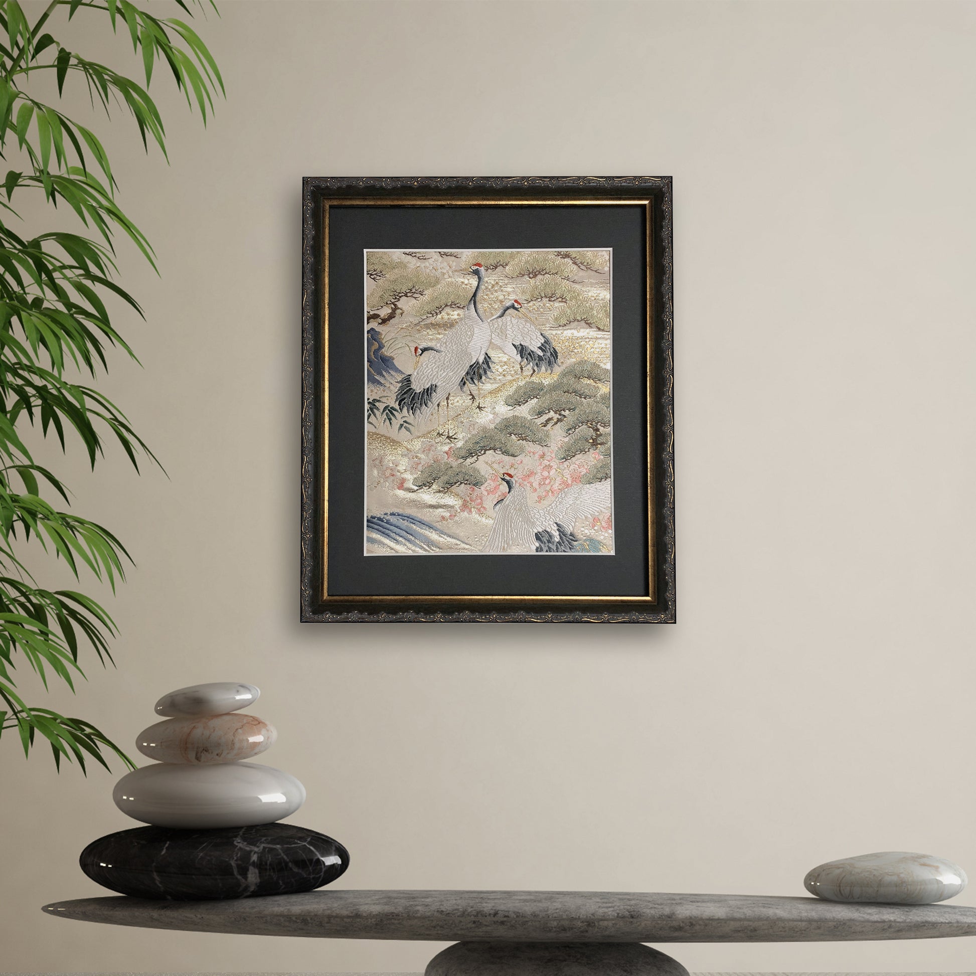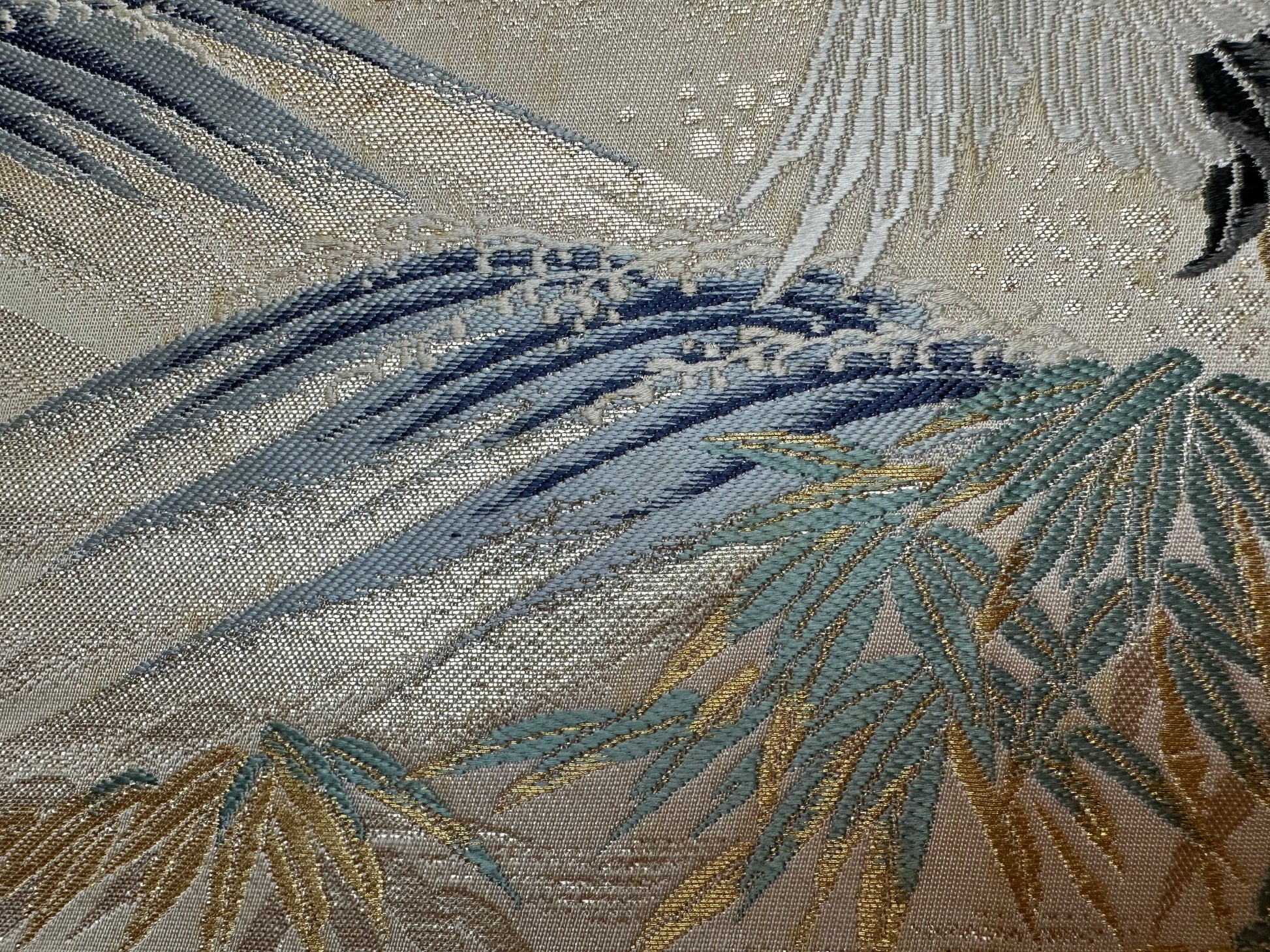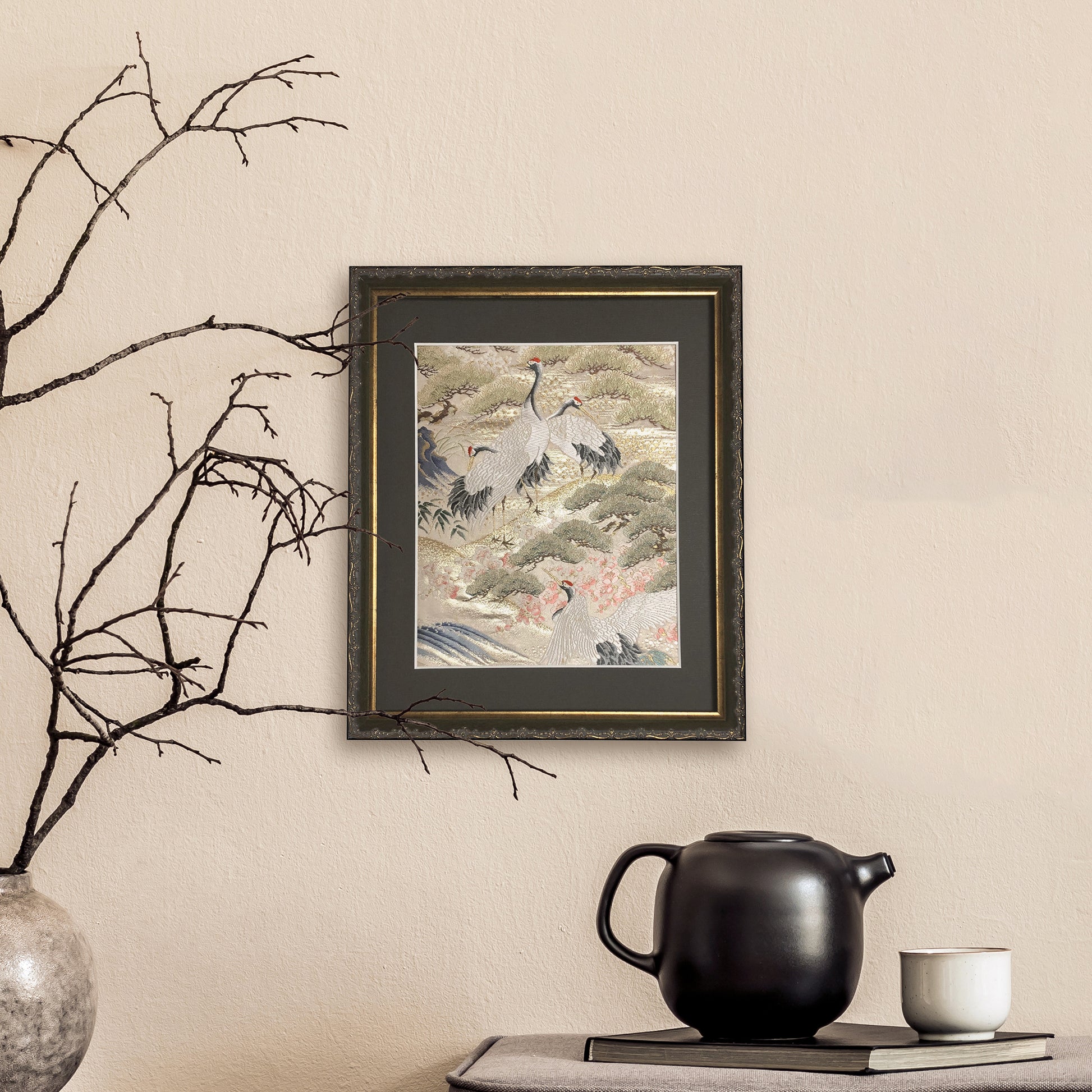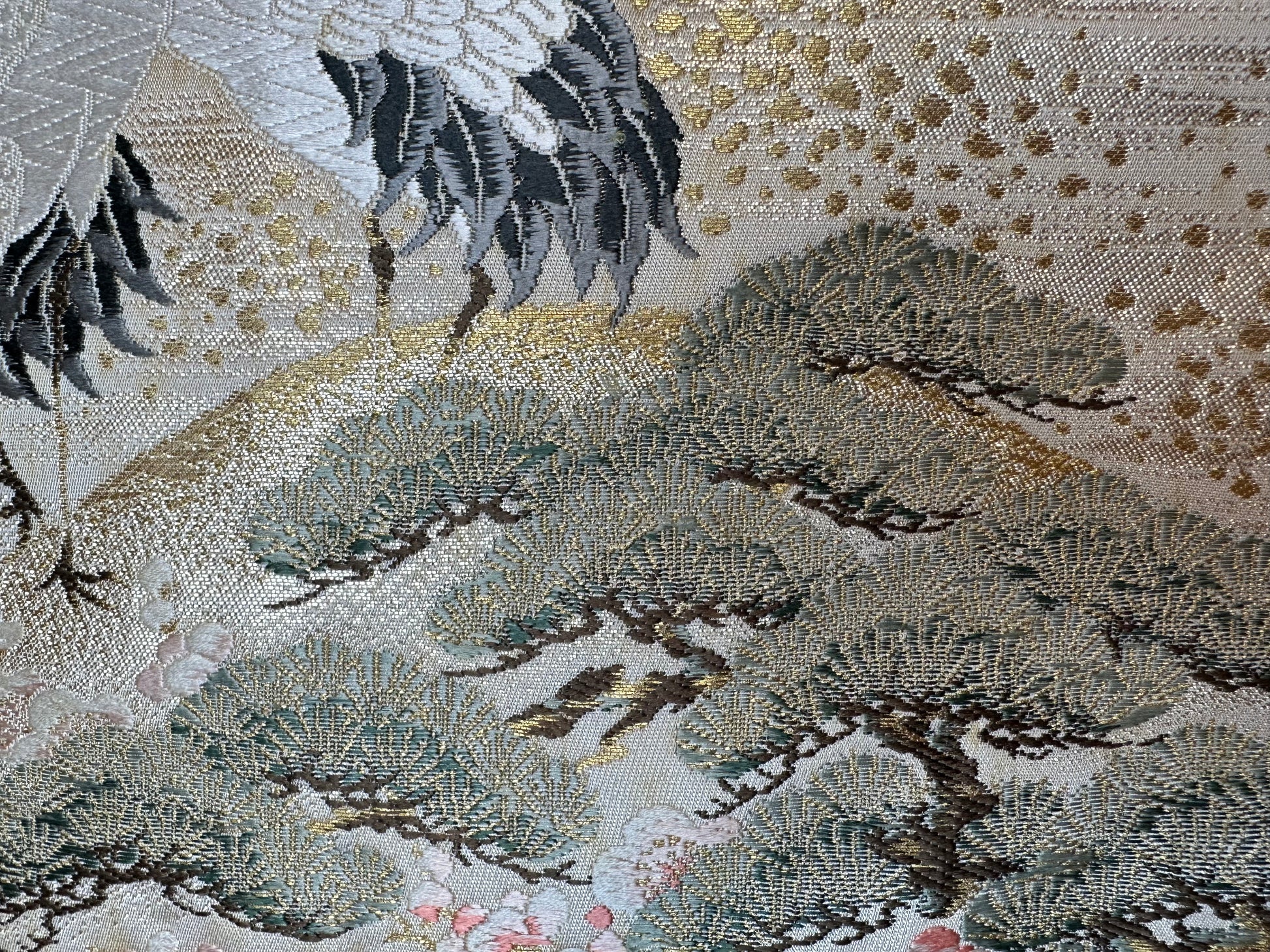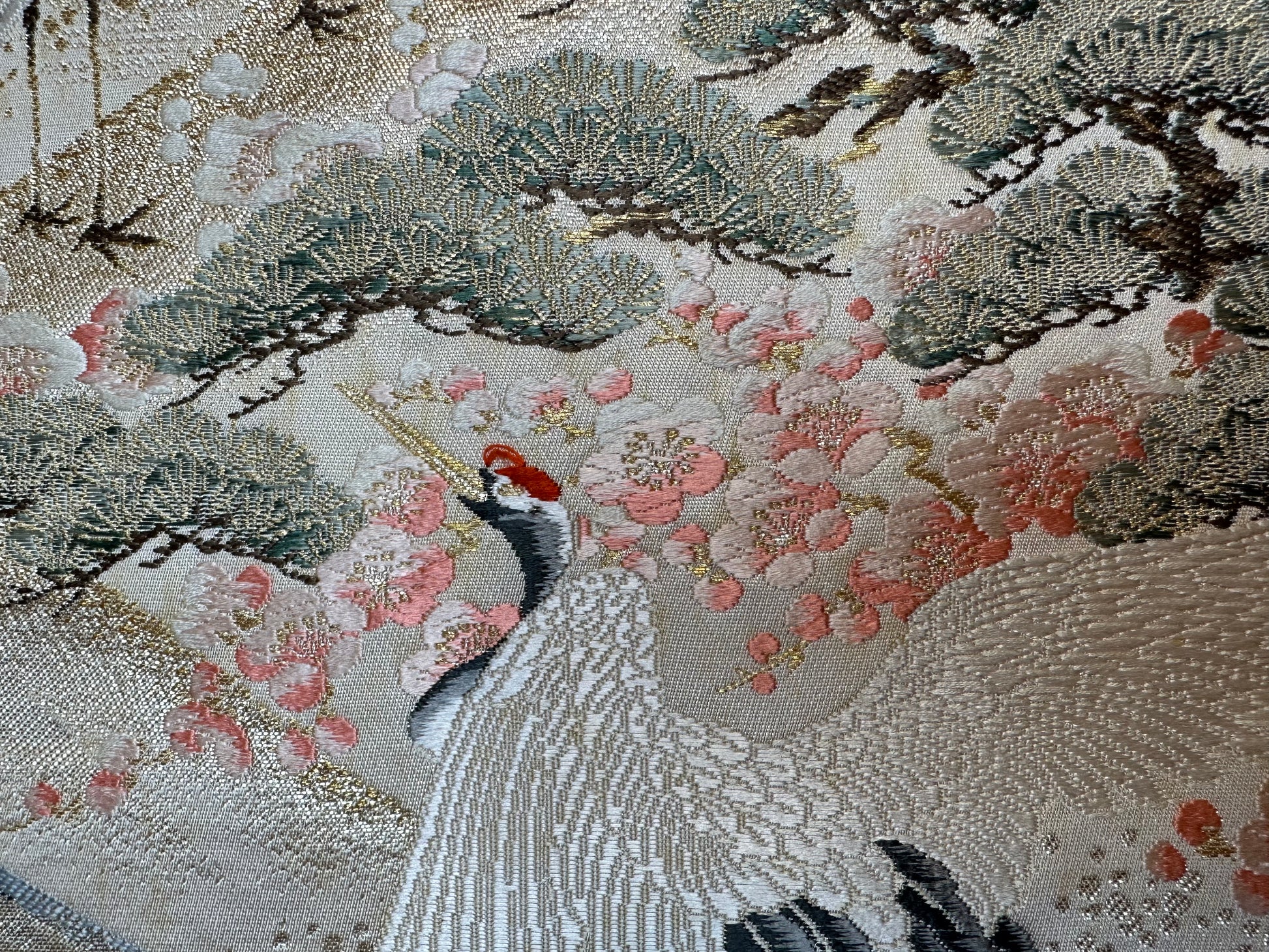 This is a one-of-a-kind Kimono Art by Kimono-Couture, meticulously crafted using the finest quality Japanese kimono obi. The title of this Kimono Art piece is ""The Crane's Departure."" As the name suggests, the central theme of this artwork is the crane. The crane motif on the kimono is a symbol of good fortune and has been cherished in Japan for generations.