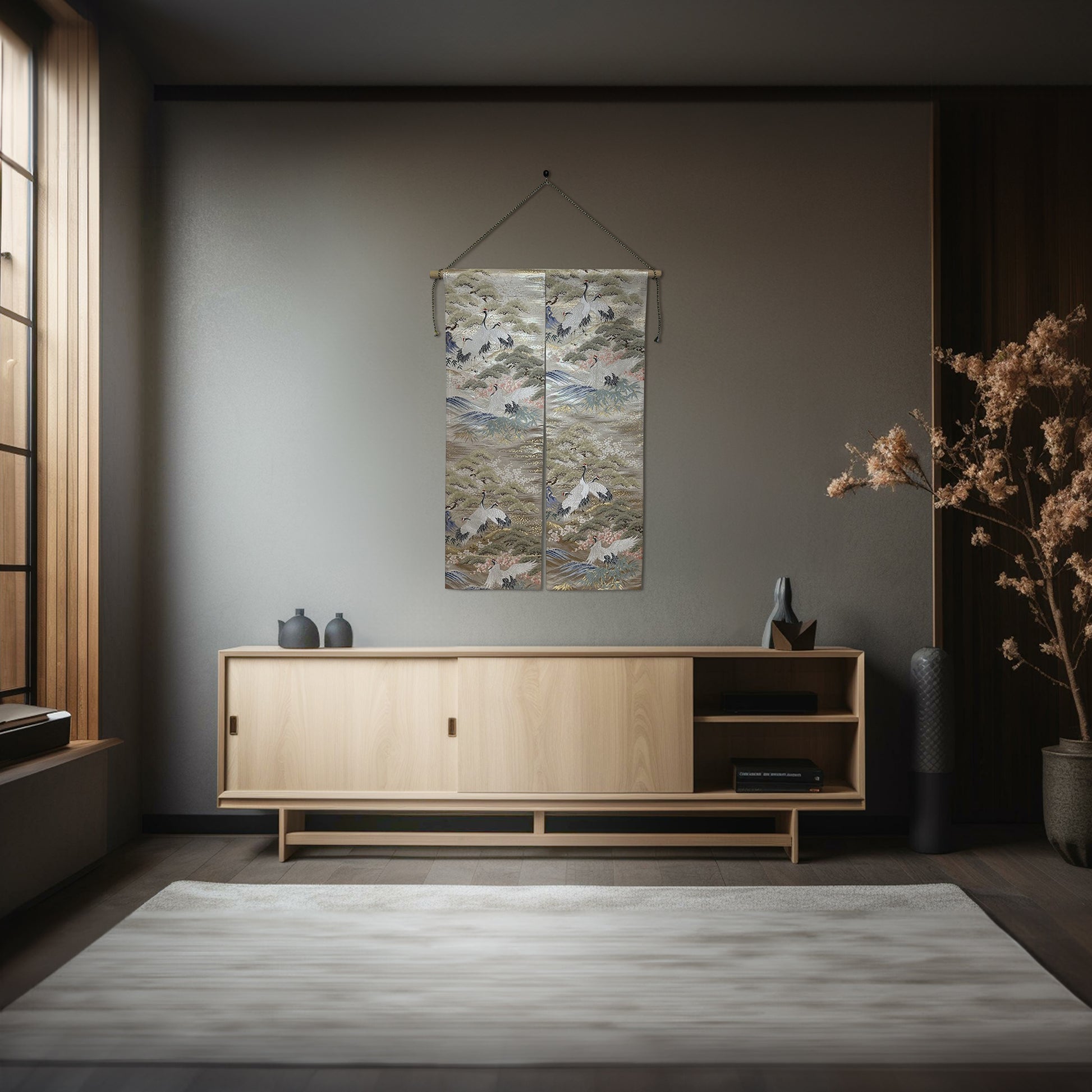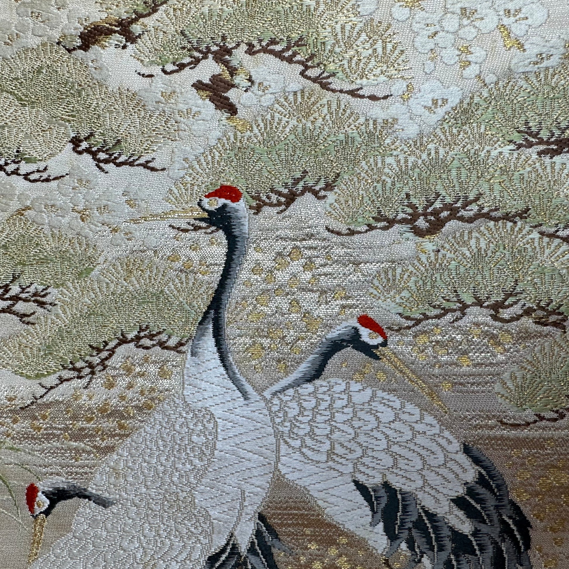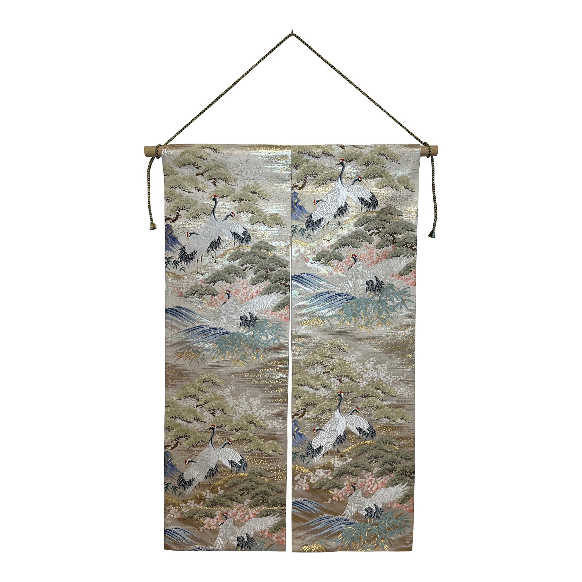 This is a one-of-a-kind Japanese Hanging Scroll by Kimono-Couture, meticulously crafted using the finest quality kimono obi. The title of this Kimono Art is "The Crane's Departure." As the name suggests, the central theme of this Japanese Hanging Scroll is the crane. The crane motif on the kimono is a symbol of good fortune and has been cherished in Japan for generations.