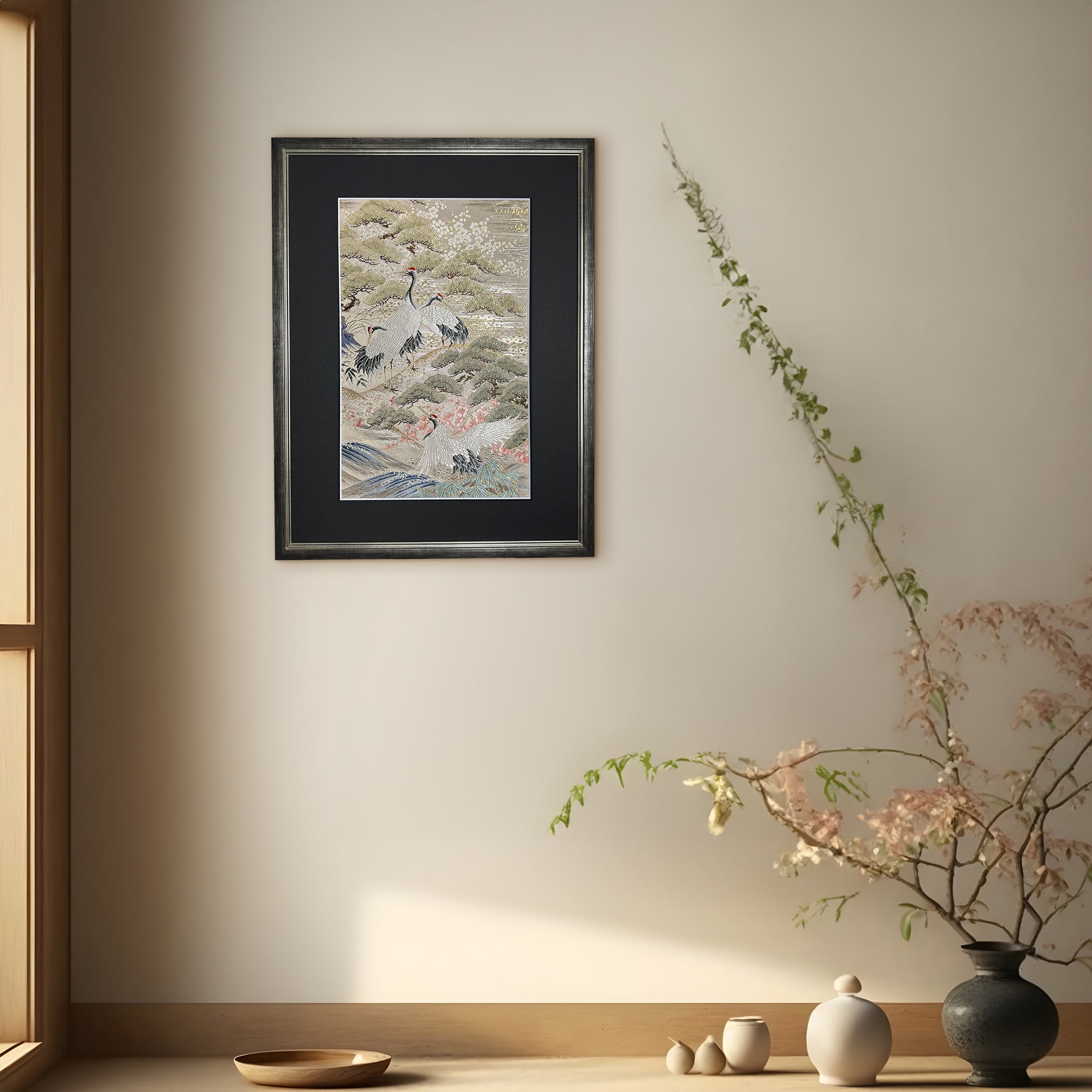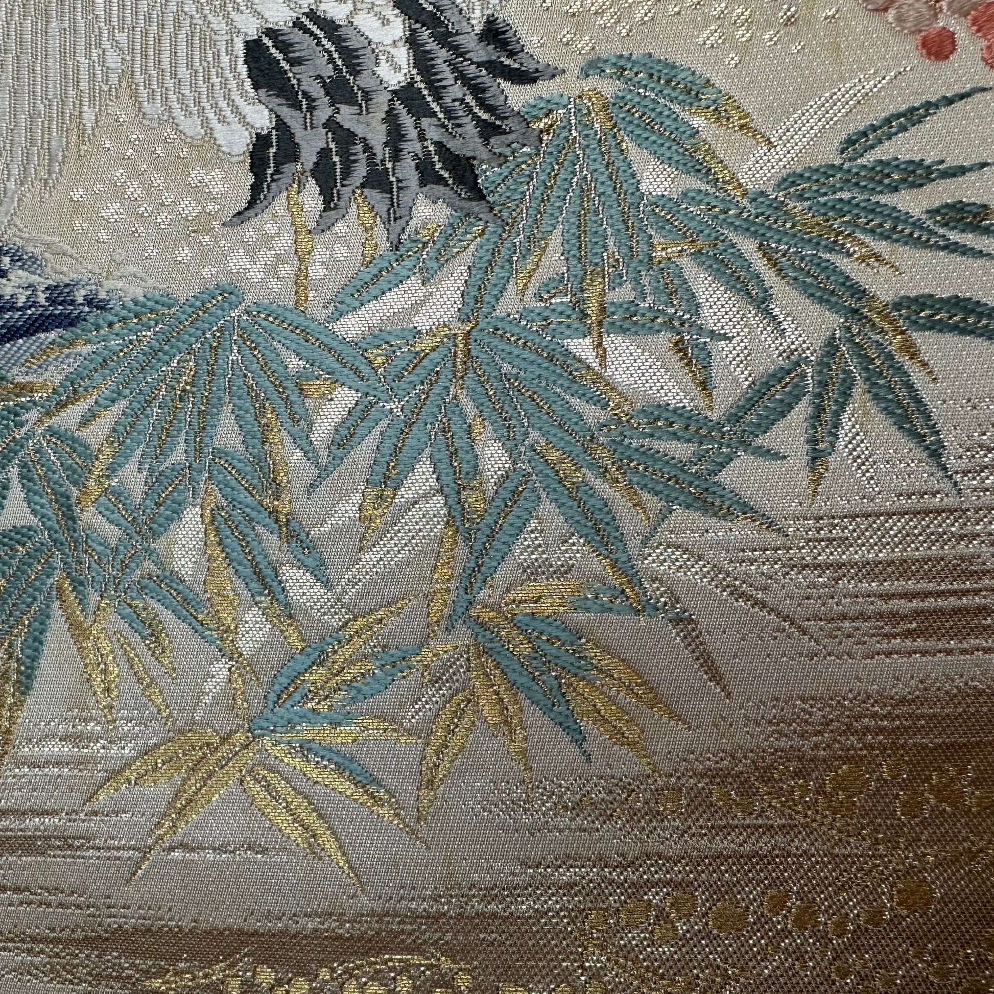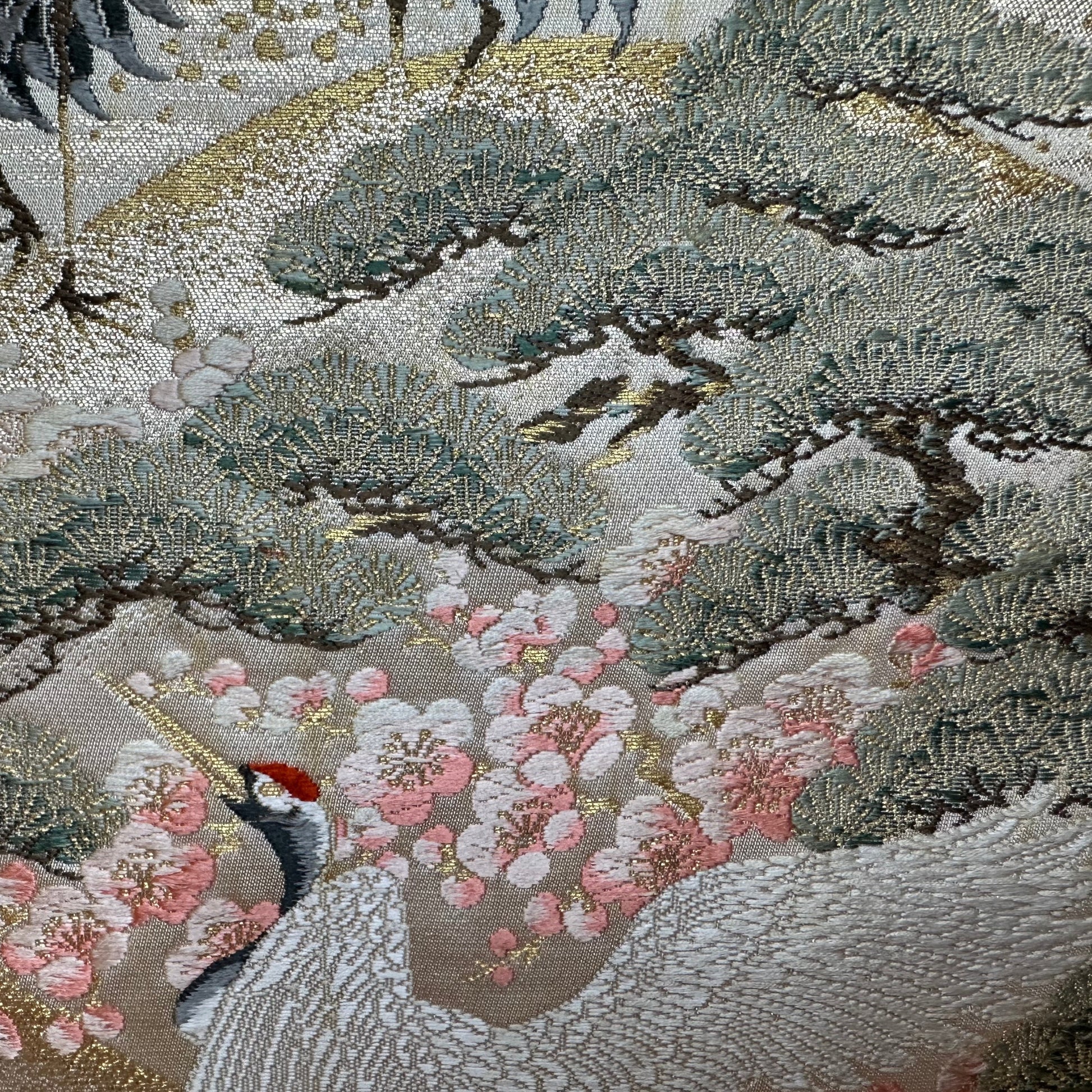 This is a one-of-a-kind Kimono Art by Kimono-Couture, meticulously crafted using the finest quality Japanese kimono obi. The title of this Kimono Art piece is "The Crane's Departure." As the name suggests, the central theme of this artwork is the crane. The crane motif on the kimono is a symbol of good fortune and has been cherished in Japan for generations.