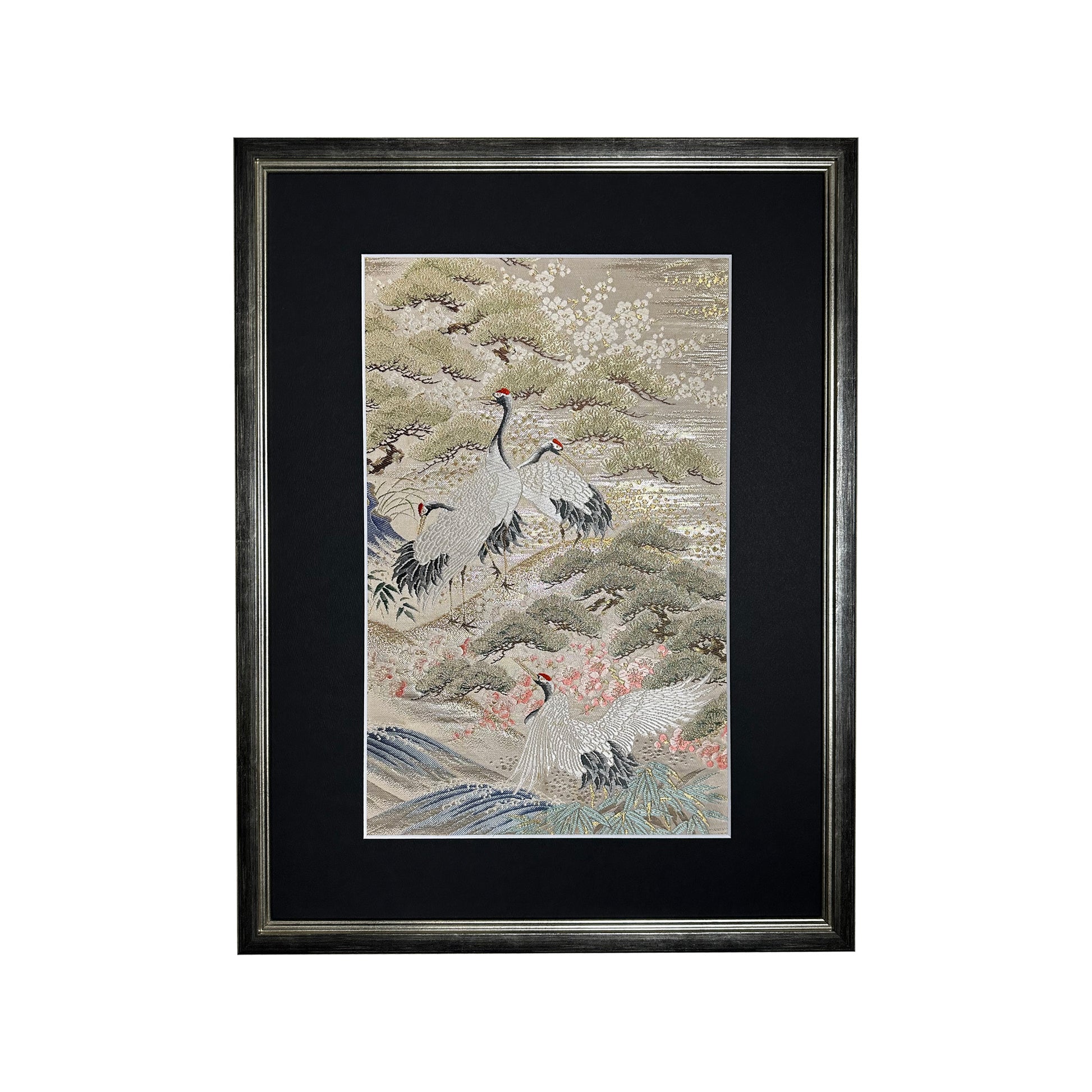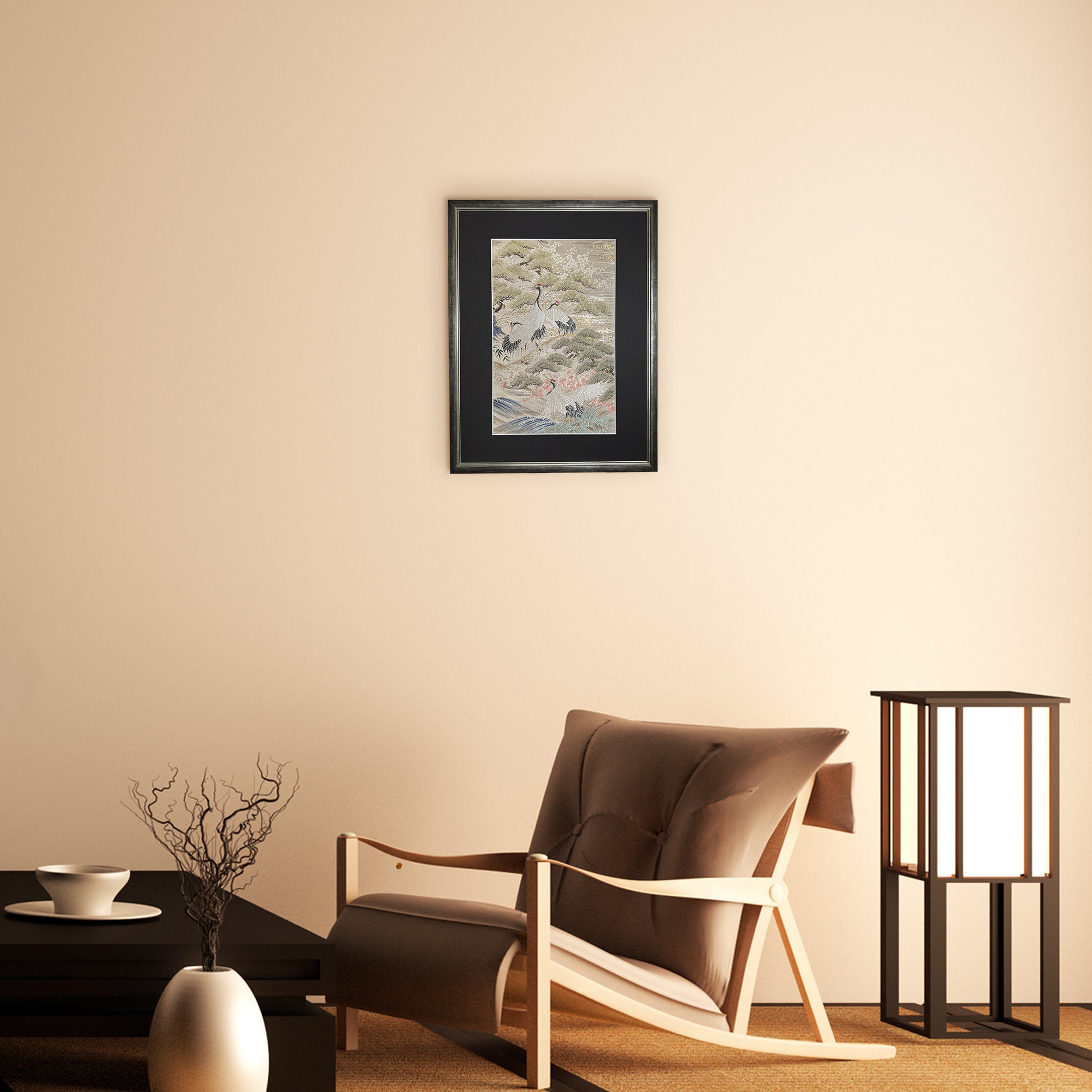In addition to the crane, this Kimono Art features motifs of pine, bamboo, plum blossoms, and waves. In the world of kimono, these symbols represent the brilliance of life and longevity (pine, bamboo, and plum), as well as the desire for everlasting happiness (waves).