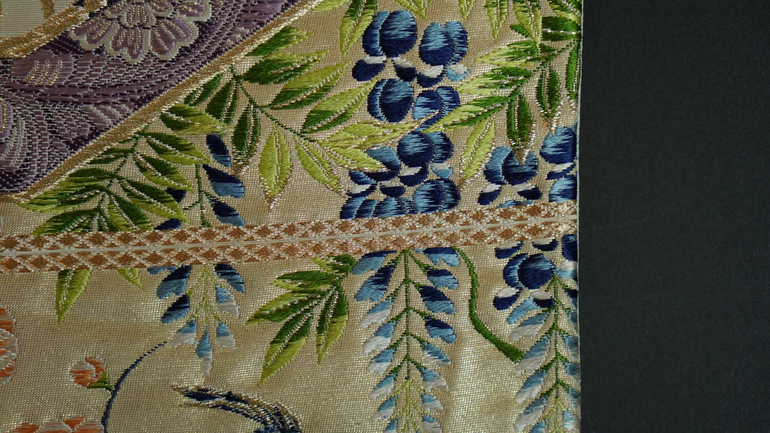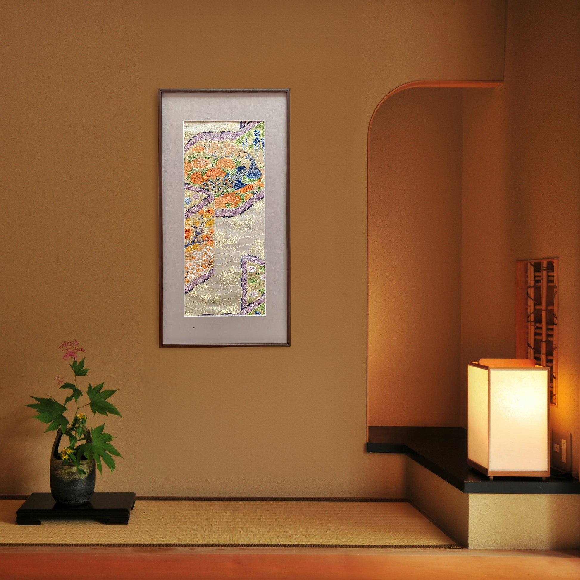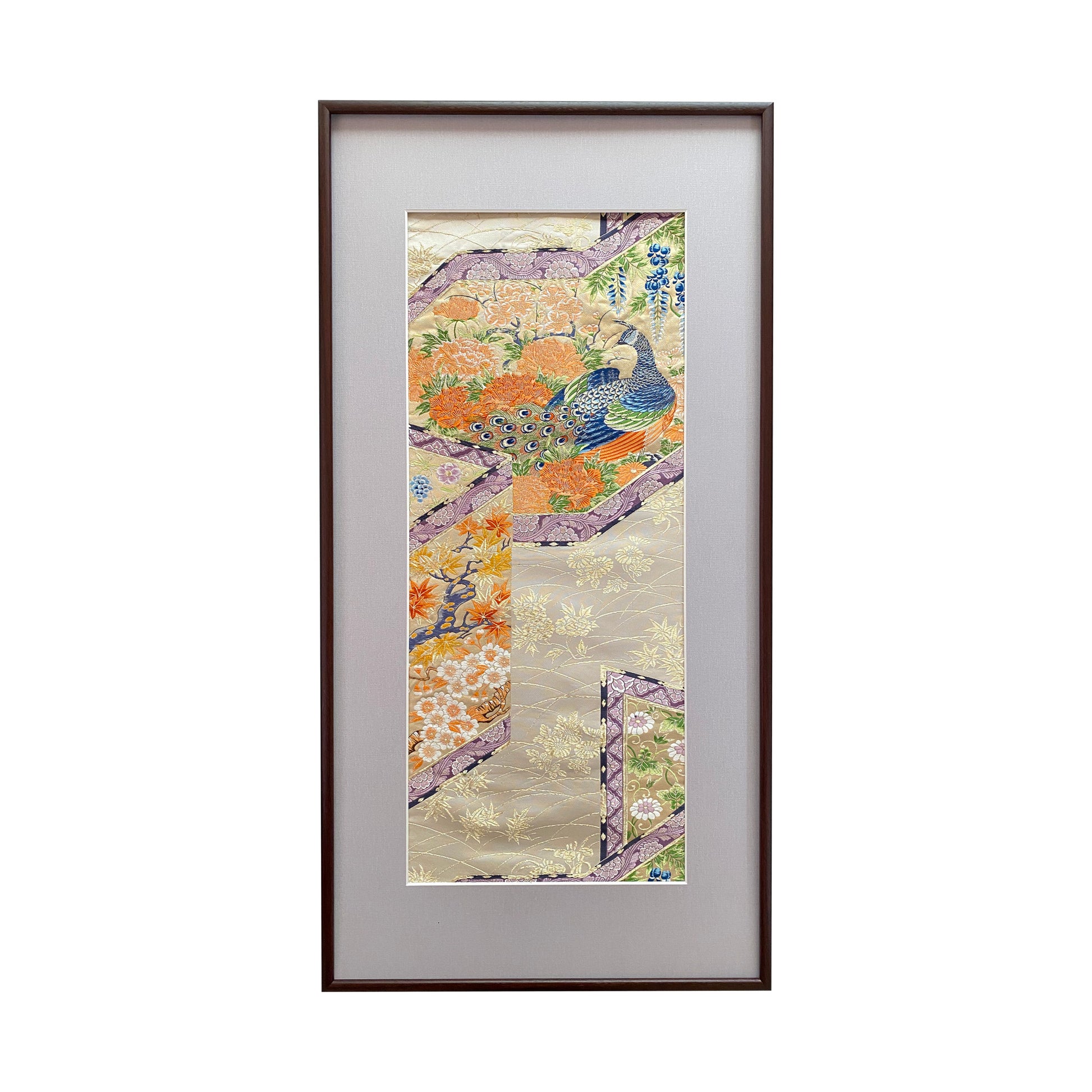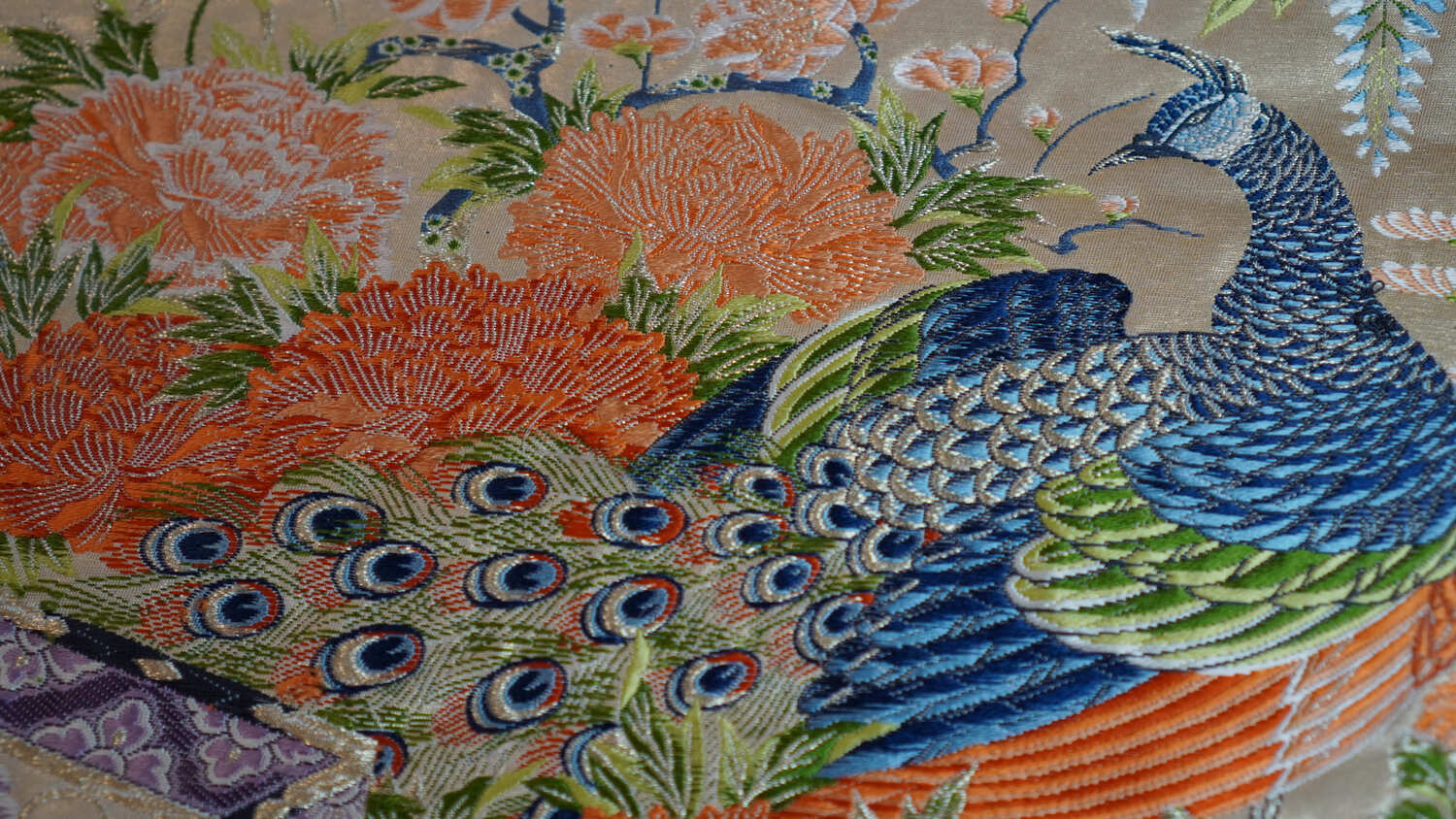 This work of art, carefully and painstakingly embroidered by Japanese craftsmen, is the only one of its kind in the world. We are proud to present this piece, embroidered with peacocks and flowers of the four seasons on a silk fabric based on the traditional color called “Kinari.” The peacock symbolizes “compassion,” “fertility” and “good health.” Because its life force is so strong that it eats poisonous snakes and insects, the peacock is believed to ward off evil spirits and prevent against “misfortune” and “suffering.” Japan is famous for its drastically different seasons. As the colorful flowers bloom, we can sense that the seasons are changing. Each of the flowers on this piece are carefully chosen. Plum blossoms, wisteria, and cherry blossoms in the spring; iris and hollyhock blossoms in the summer; chrysanthemum blossoms and grapes in autumn; and peony blossoms in the winter. This is a wonderful piece that your guests will surely admire. Let this gem be a part of your life.