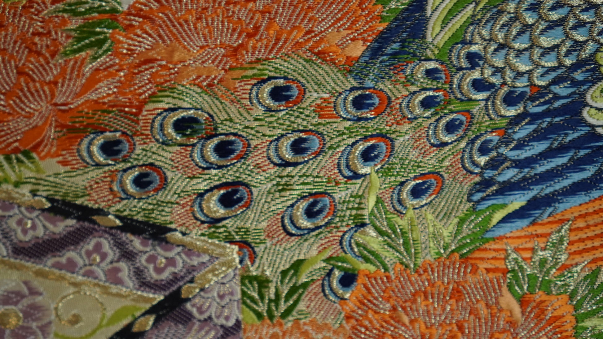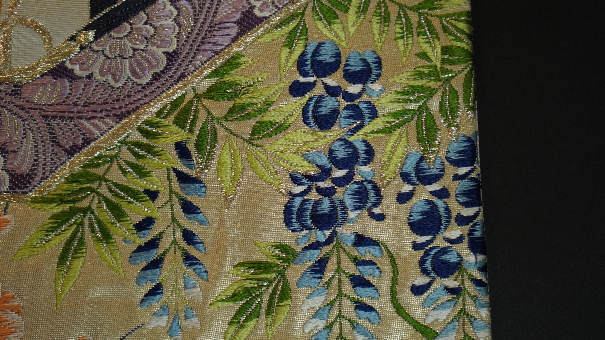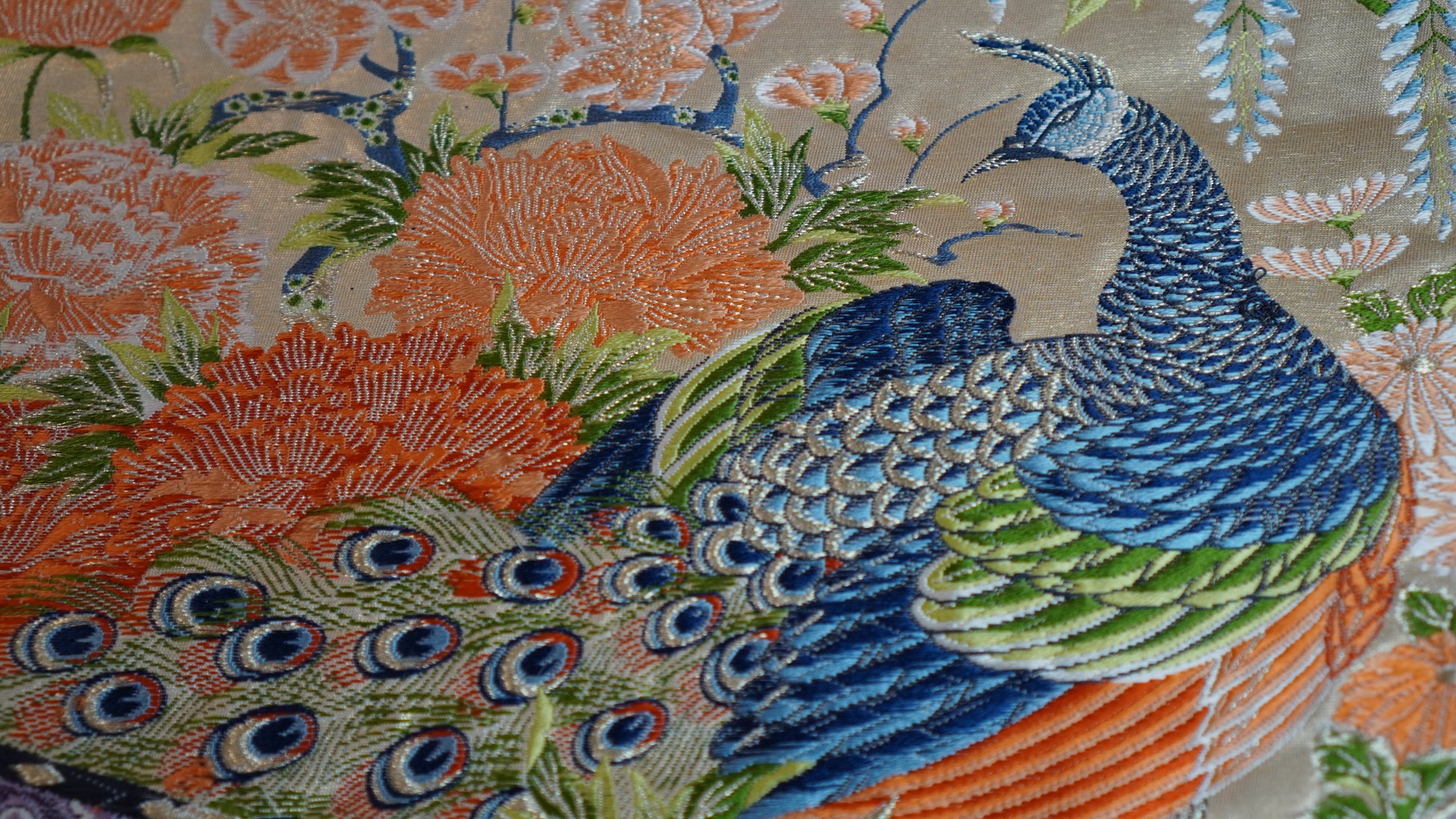 This work of art, carefully and painstakingly embroidered by Japanese craftsmen, is the only one of its kind in the world. We are proud to present this piece, embroidered with peacocks and flowers of the four seasons on a silk fabric based on the traditional color called “Kinari.” The peacock symbolizes “compassion,” “fertility” and “good health.” Because its life force is so strong that it eats poisonous snakes and insects, the peacock is believed to ward off evil spirits and prevent against “misfortune” and “suffering.” Japan is famous for its drastically different seasons. As the colorful flowers bloom, we can sense that the seasons are changing. Each of the flowers on this piece are carefully chosen. Plum blossoms, wisteria, and cherry blossoms in the spring; iris and hollyhock blossoms in the summer; chrysanthemum blossoms and grapes in autumn; and peony blossoms in the winter. This is a wonderful piece that your guests will surely admire. Let this gem be a part of your life.