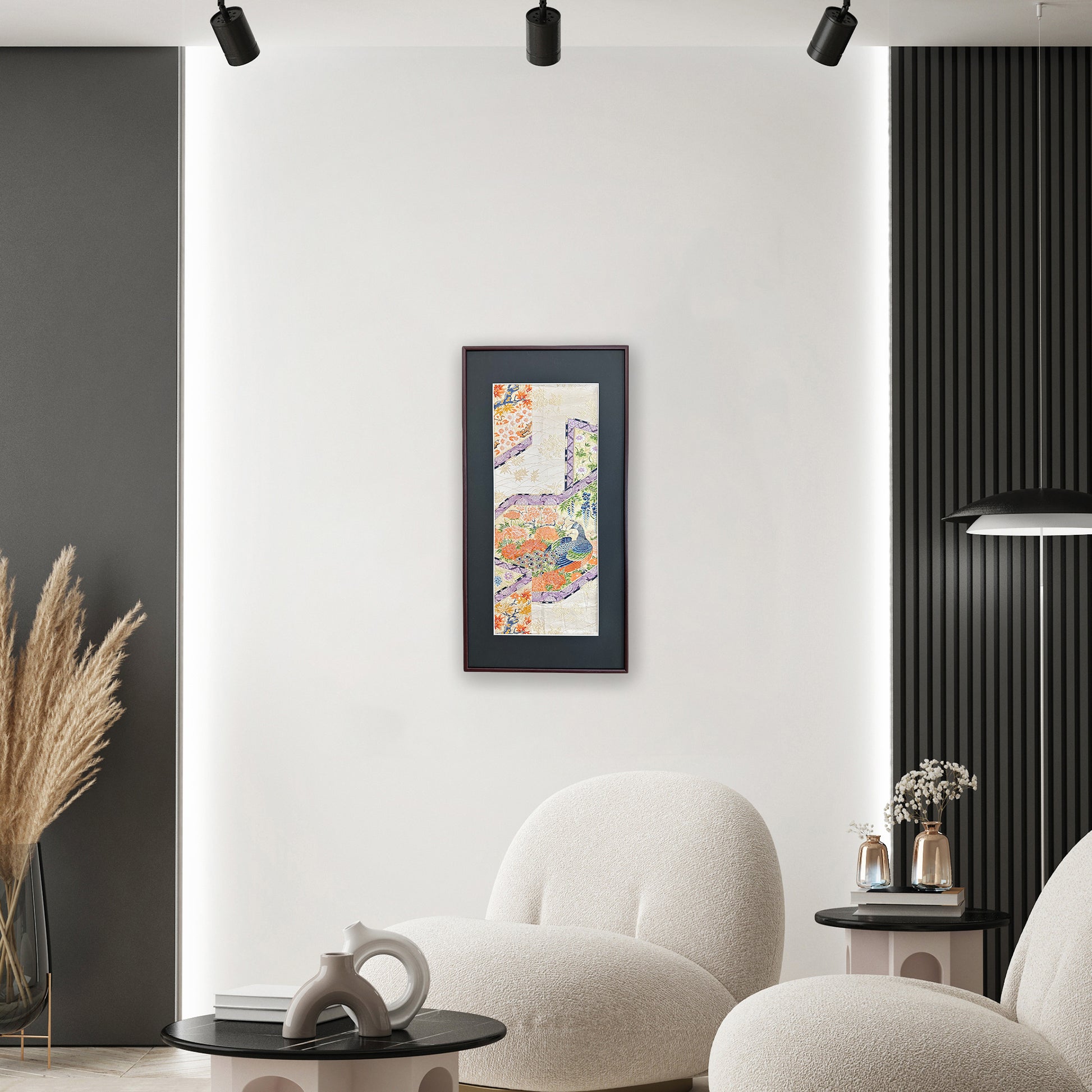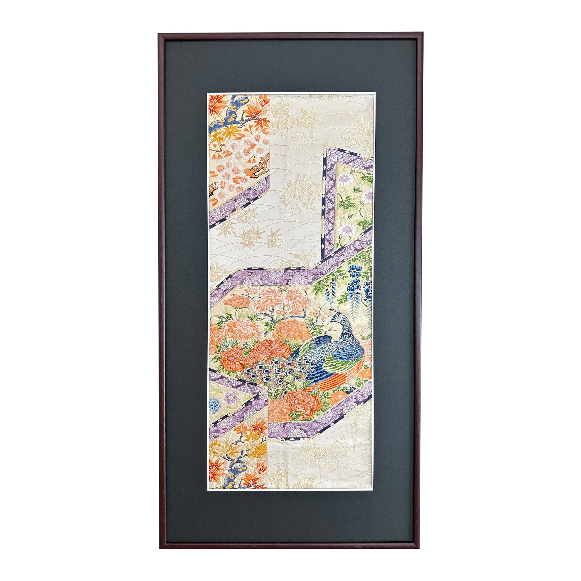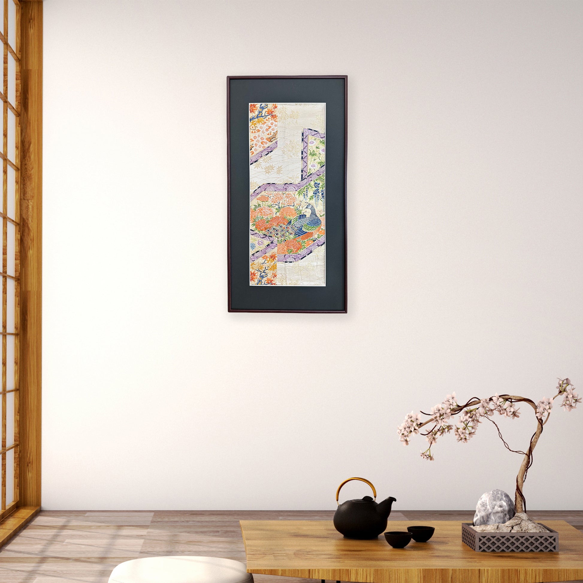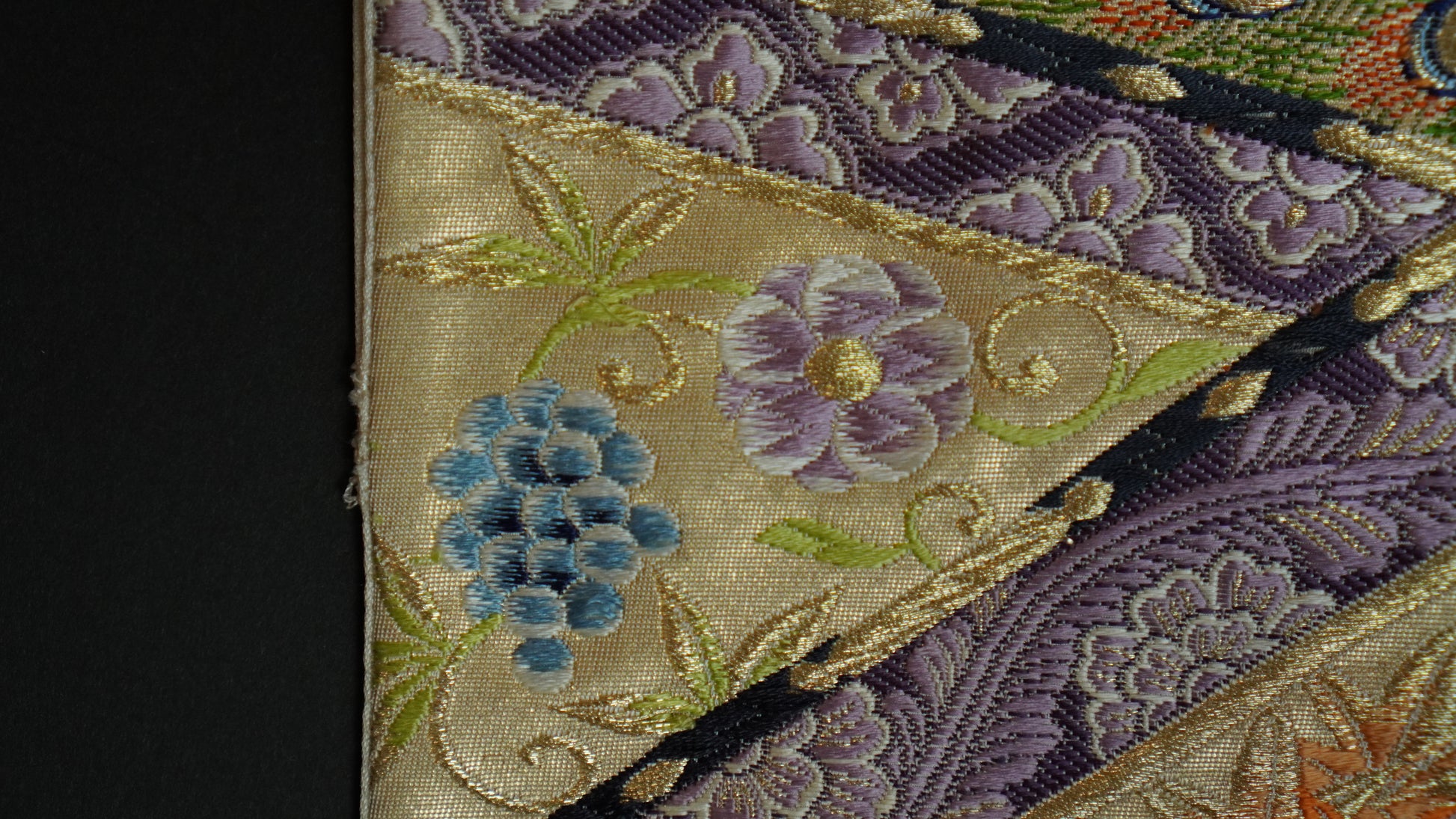 This work of art, carefully and painstakingly embroidered by Japanese craftsmen, is the only one of its kind in the world. We are proud to present this piece, embroidered with peacocks and flowers of the four seasons on a silk fabric based on the traditional color called “Kinari.” The peacock symbolizes “compassion,” “fertility” and “good health.” Because its life force is so strong that it eats poisonous snakes and insects, the peacock is believed to ward off evil spirits and prevent against “misfortune” and “suffering.” Japan is famous for its drastically different seasons. As the colorful flowers bloom, we can sense that the seasons are changing. Each of the flowers on this piece are carefully chosen. Plum blossoms, wisteria, and cherry blossoms in the spring; iris and hollyhock blossoms in the summer; chrysanthemum blossoms and grapes in autumn; and peony blossoms in the winter. This is a wonderful piece that your guests will surely admire. Let this gem be a part of your life.