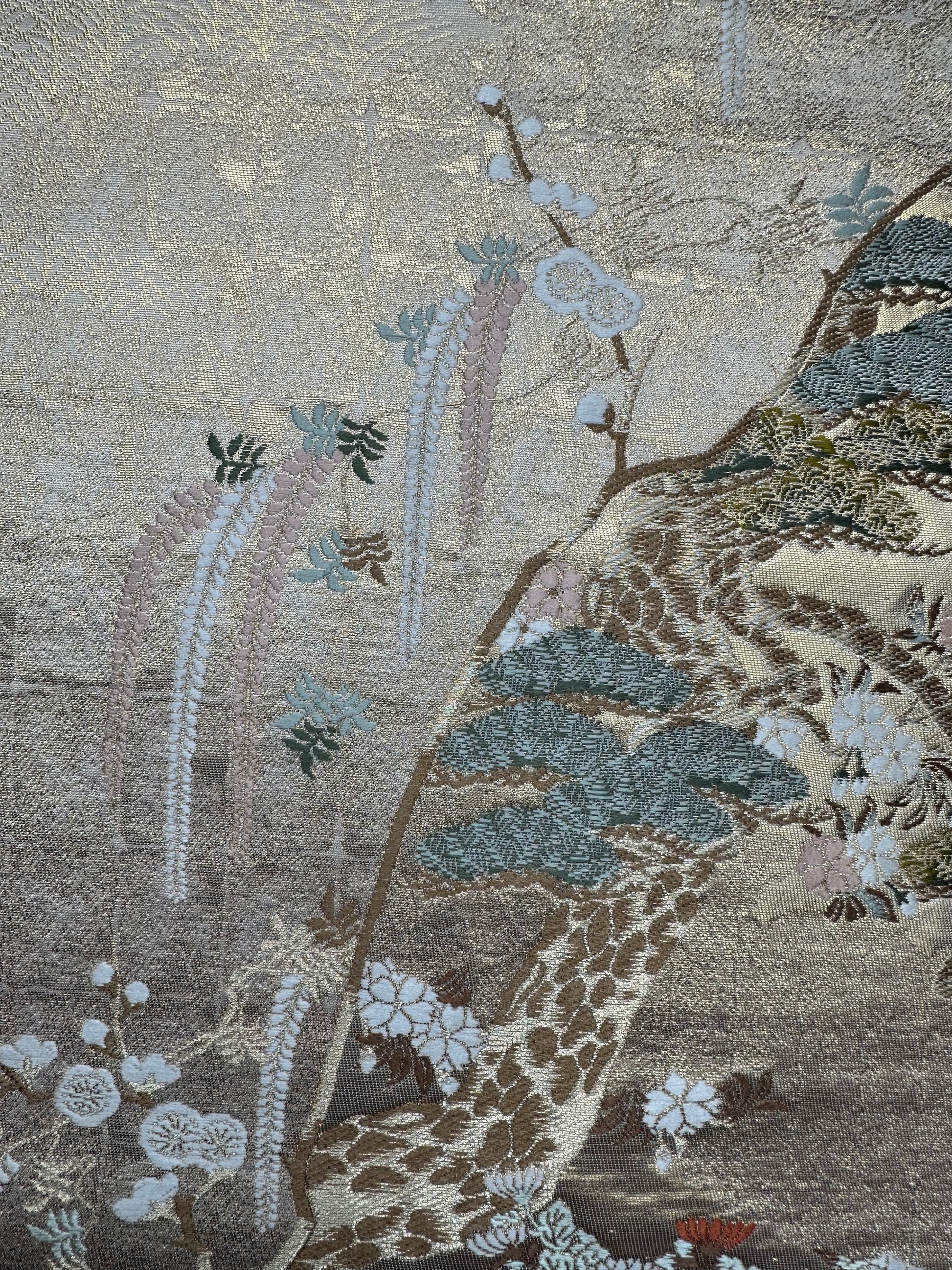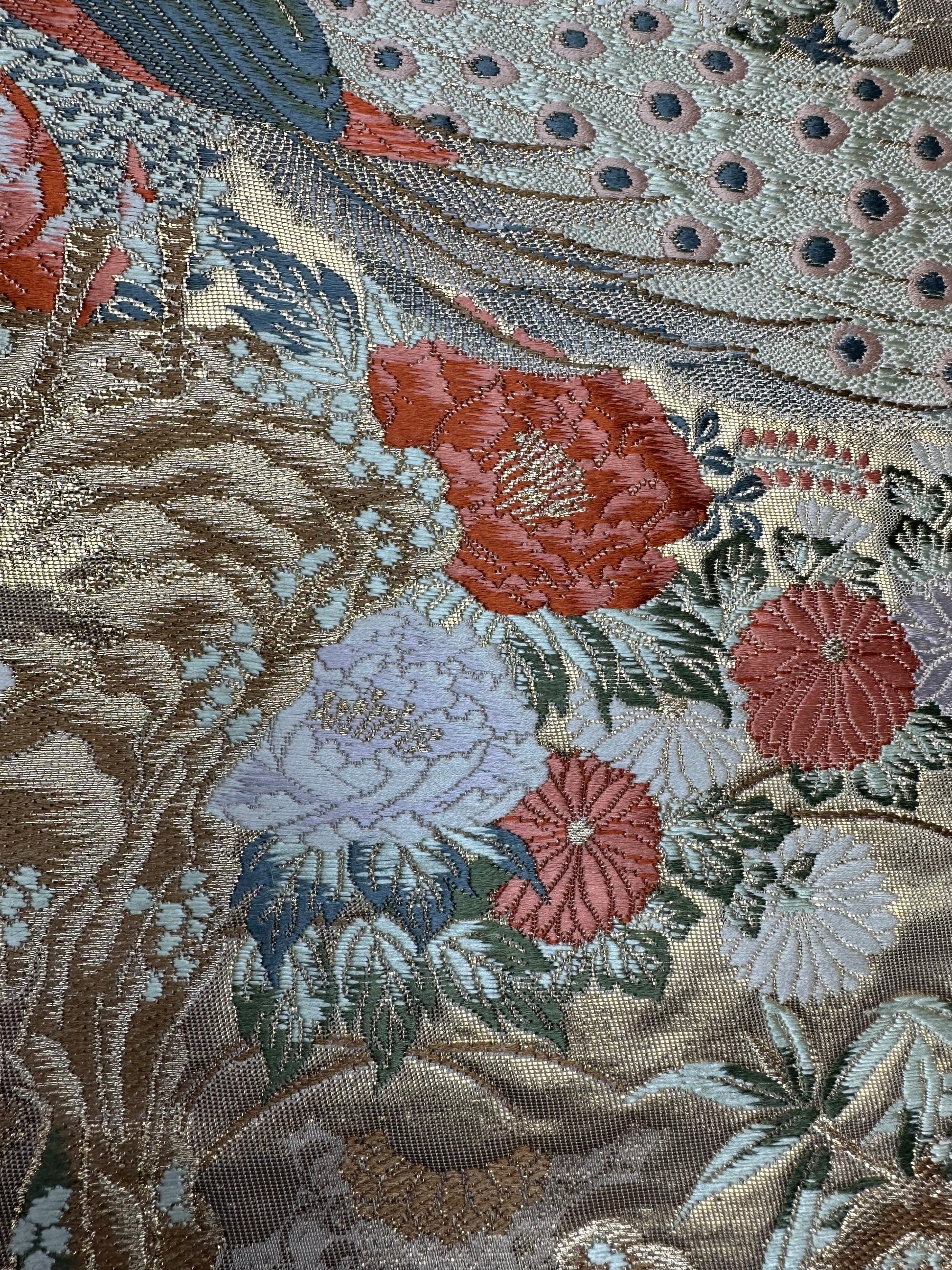 This obi is also embroidered with a peacock, known for its beautiful feathers. The peacock symbolizes “compassion,” “fertility,” and” good health”. Because its life force is so strong that it eats poisonous snakes and insects, the peacock is believed to ward off evil spirits and prevent against misfortune and suffering.