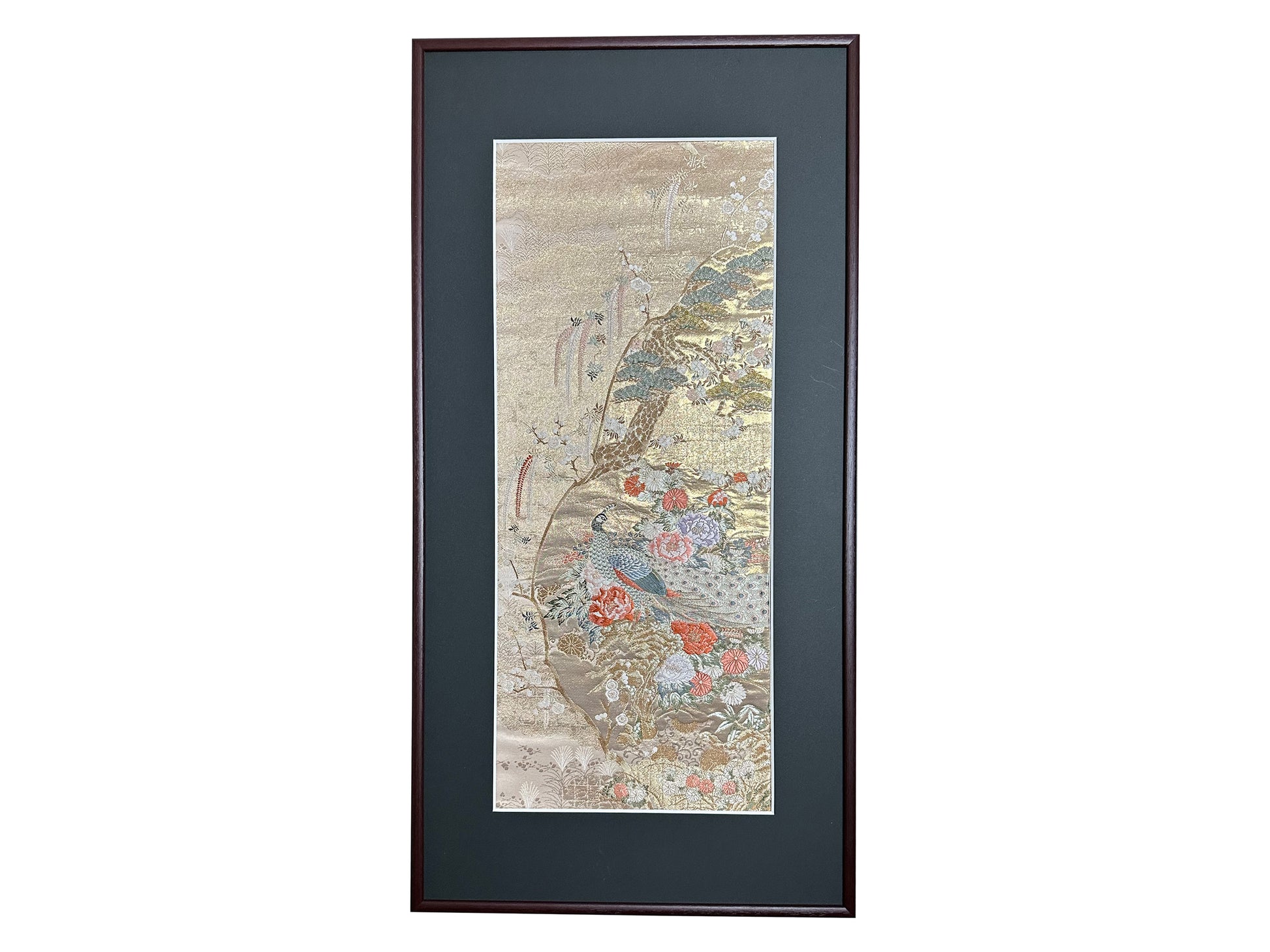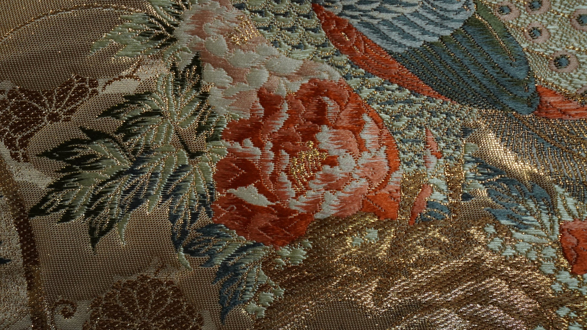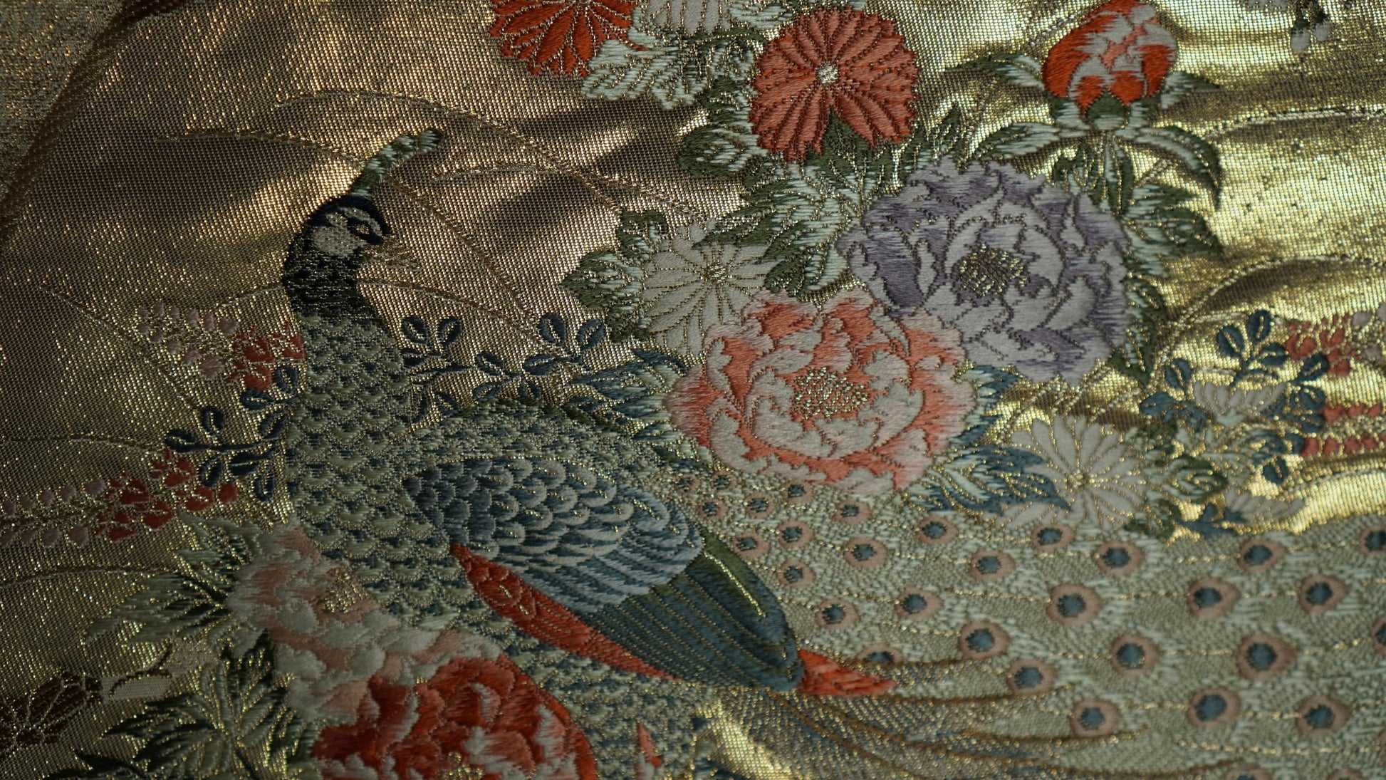 This kimono obi is also embroidered with a peacock, known for its beautiful feathers. The peacock symbolizes “compassion,” “fertility,” and” good health”. Because its life force is so strong that it eats poisonous snakes and insects, the peacock is believed to ward off evil spirits and prevent against misfortune and suffering.