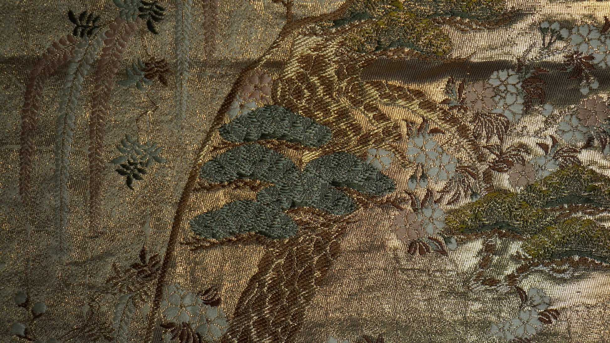 This kimono obi is made of silk and gold leaf and is decorated with an arabesque pattern. The arabesque pattern is based on ivy, which has a strong life force and grows in all directions. Because it represents vitality, the arabesque pattern was used in Edo period (1600-1868) as a symbol of longevity and prosperity.